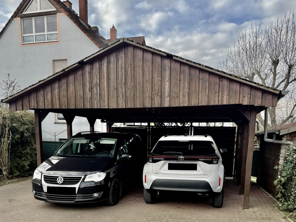 Schon die Ankunft ist angenehm unkompliziert: Ein Doppelcarport sowie zwei weitere Stellplätze davor bieten ausreichend Platz für Familie, Besuch und Alltag.