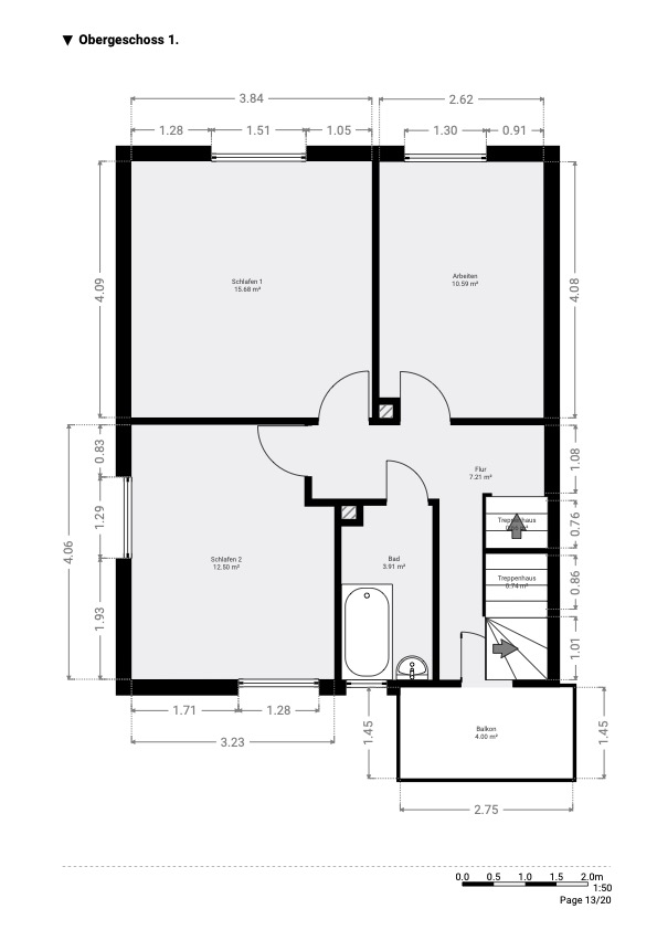 Im Obergeschoss stehen Ihnen drei Zimmer sowie ein Wannenbad und ein sich anschließender überdachter Balkon zur Verfügung – ideal als klassische Schlafebene.