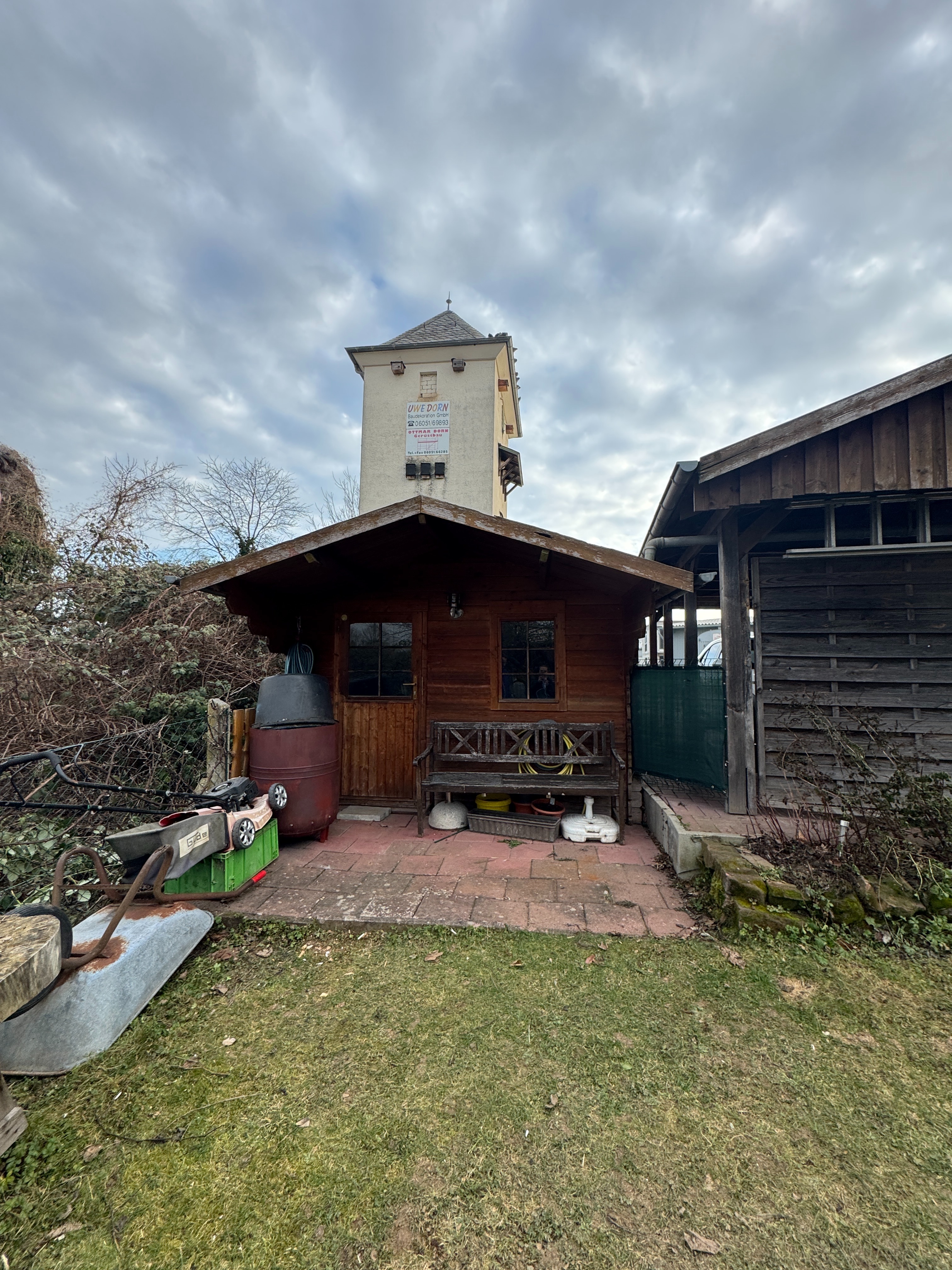 Im Garten wartet eine praktische Gartenhütte auf alles, was man draußen gerne griffbereit hat – von Fahrrädern bis Gartengeräten. Und wer Wert auf Funktionalität legt, wird auch den separaten Kellerzugang schätzen: Dinge rein und raus, ohne durchs Haus zu müssen – einfach praktisch.