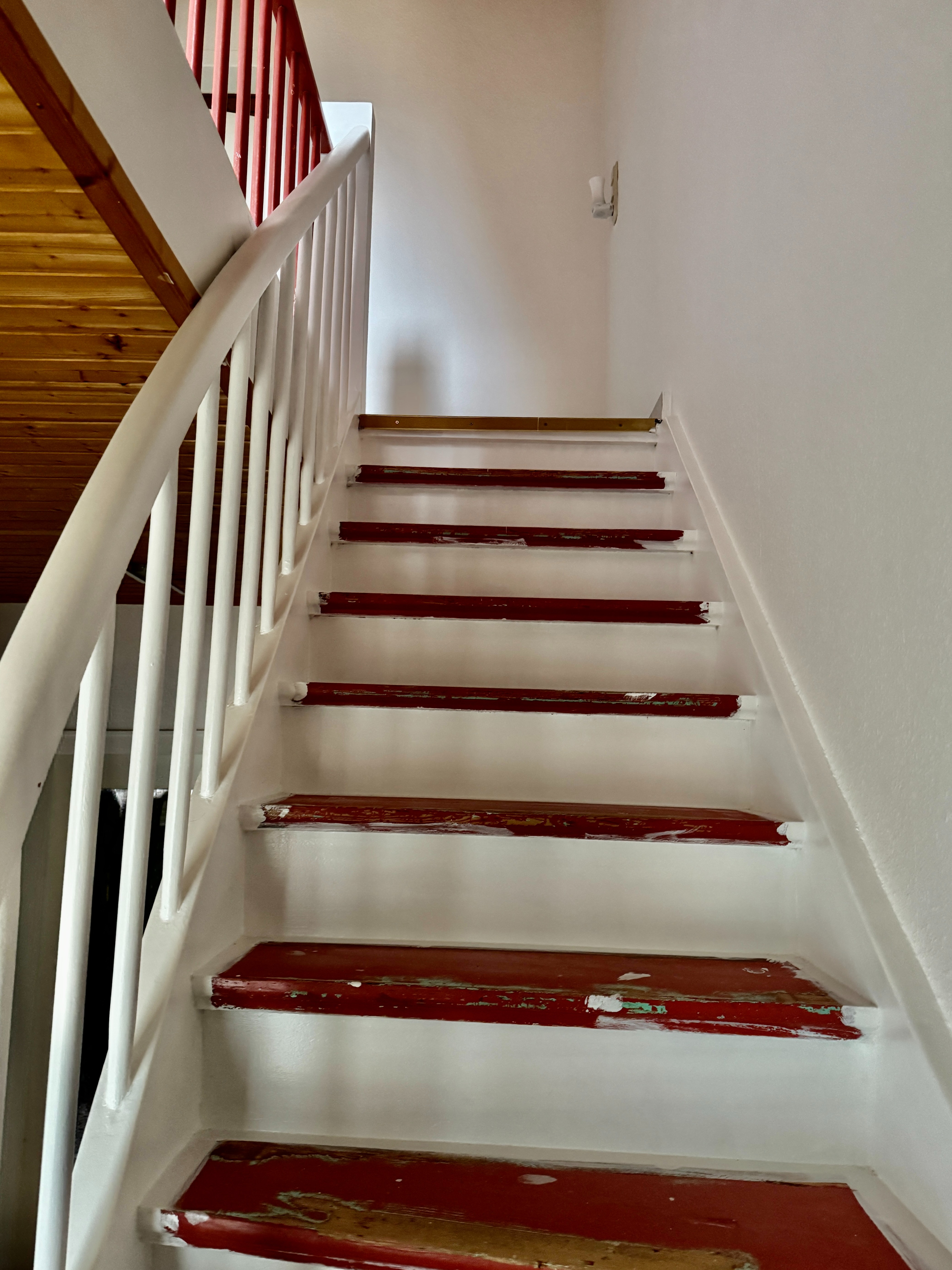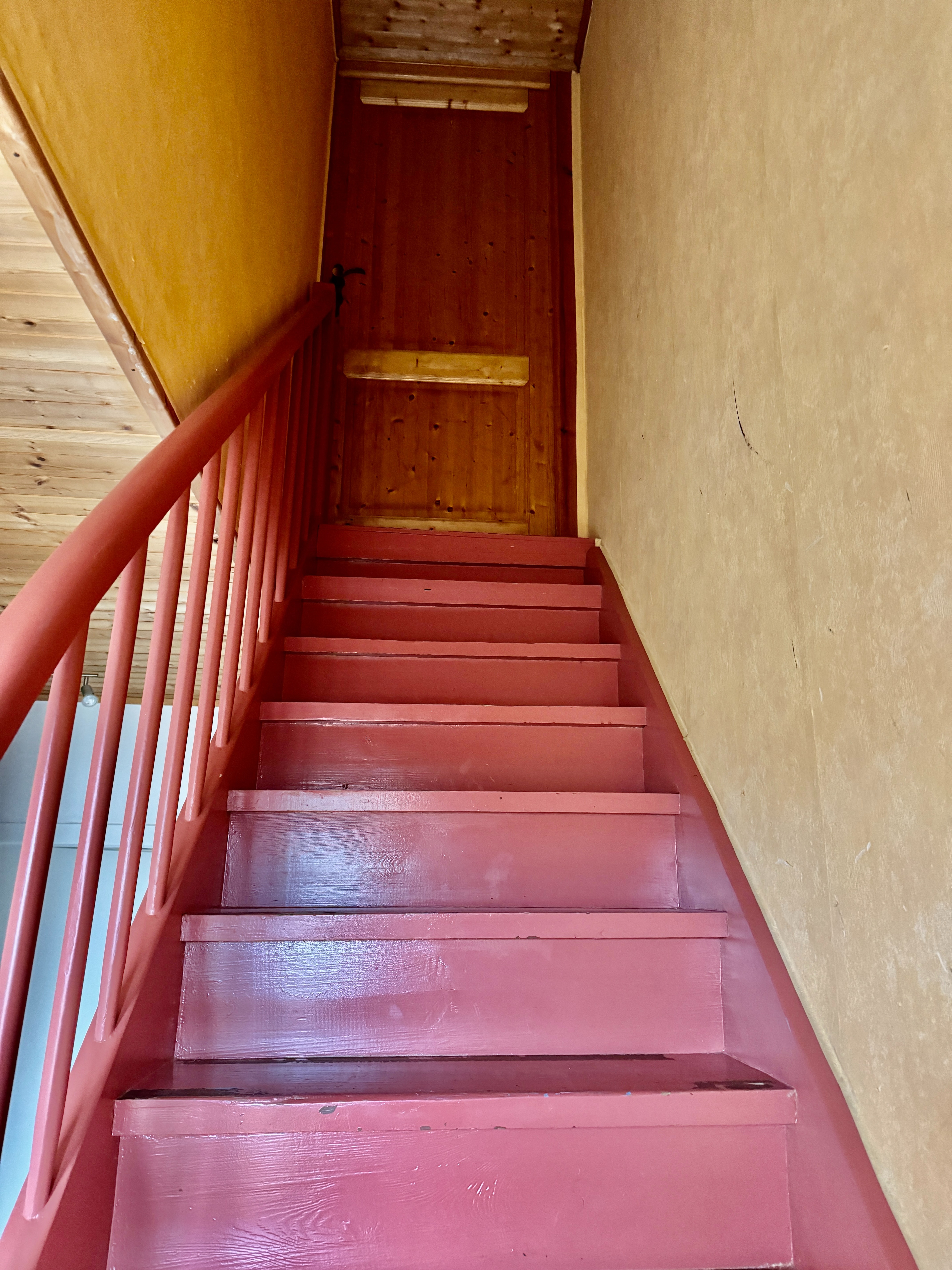 Über eine Holztreppe gelangt man in die oberen Etagen – ein charmantes Element, das dem Haus viel Atmosphäre gibt.