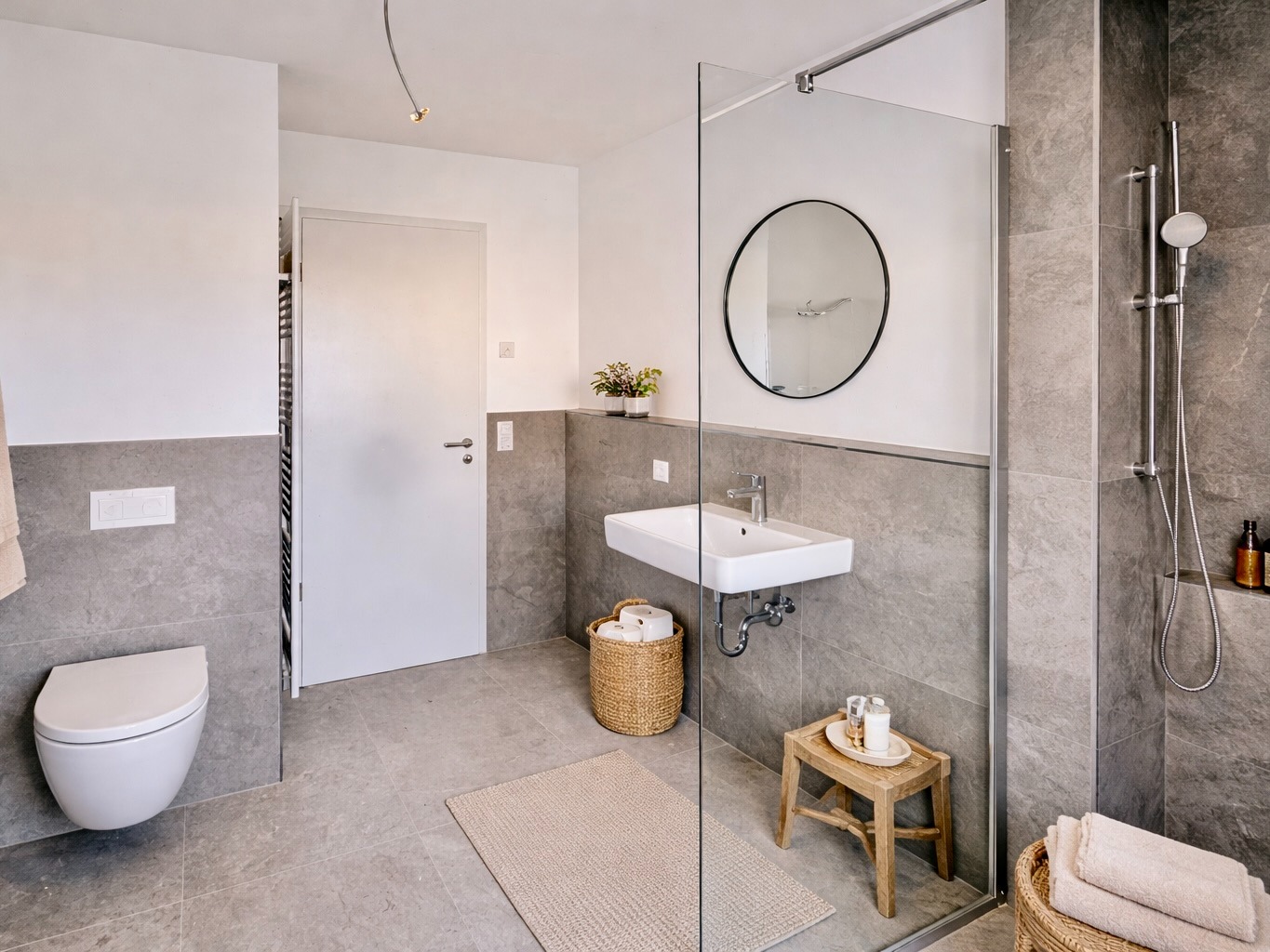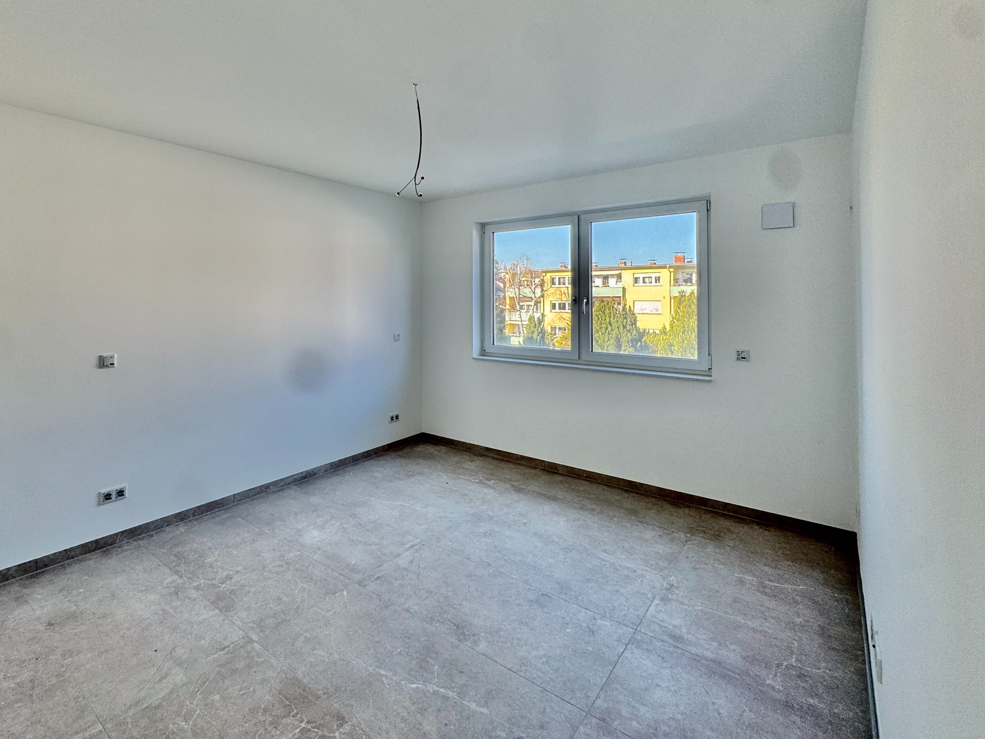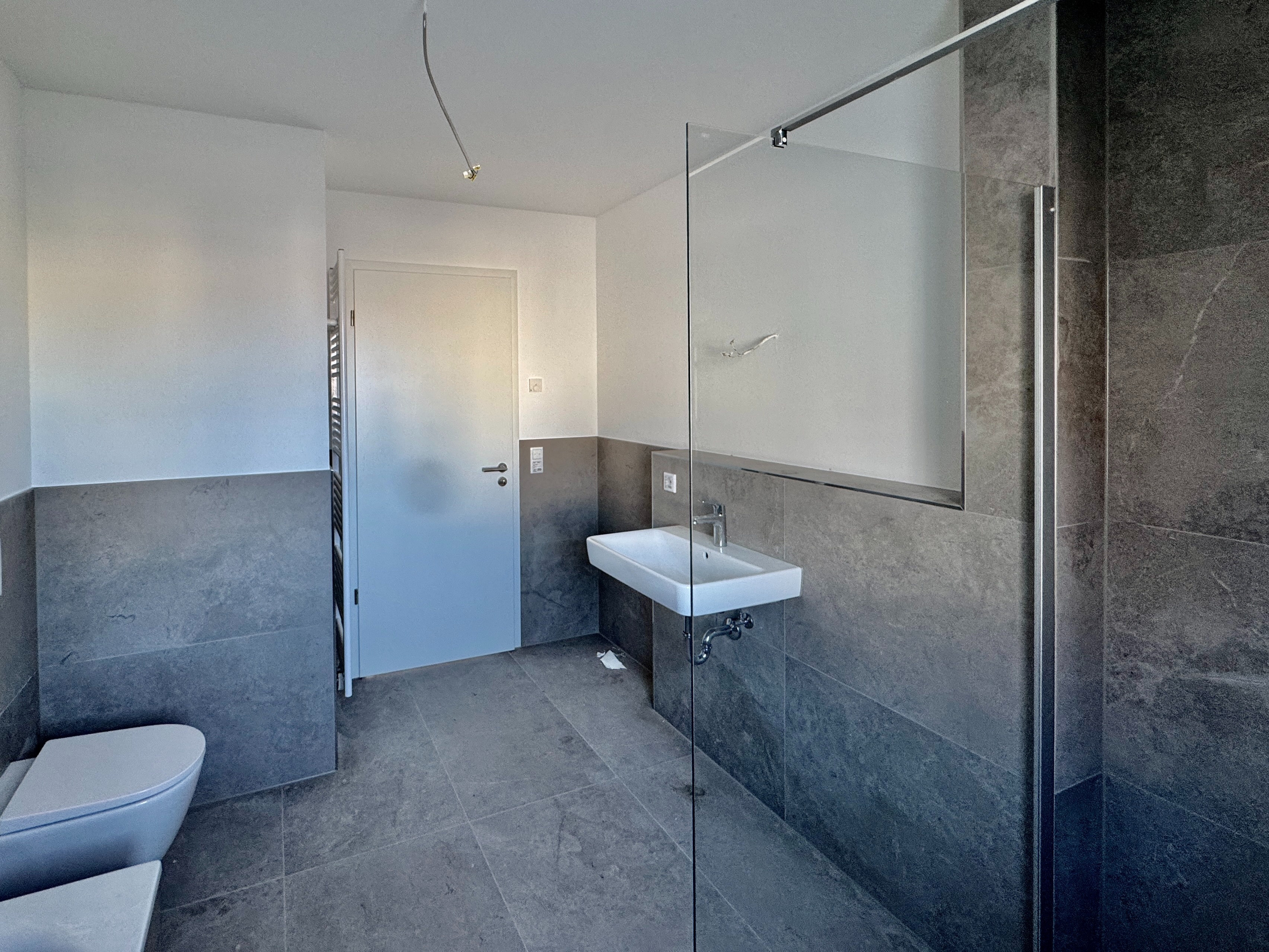 Auch bei der Ausstattung wurde konsequent auf Qualität gesetzt: Fußbodenheizung, effiziente Fernwärme, großformatige Fliesen (ca. 60 × 60 cm), Wände mit Malervlies, hochwertige Gira-Schalterserie sowie ein stilvolles Badkonzept – alles wirkt modern, klar und wertig.