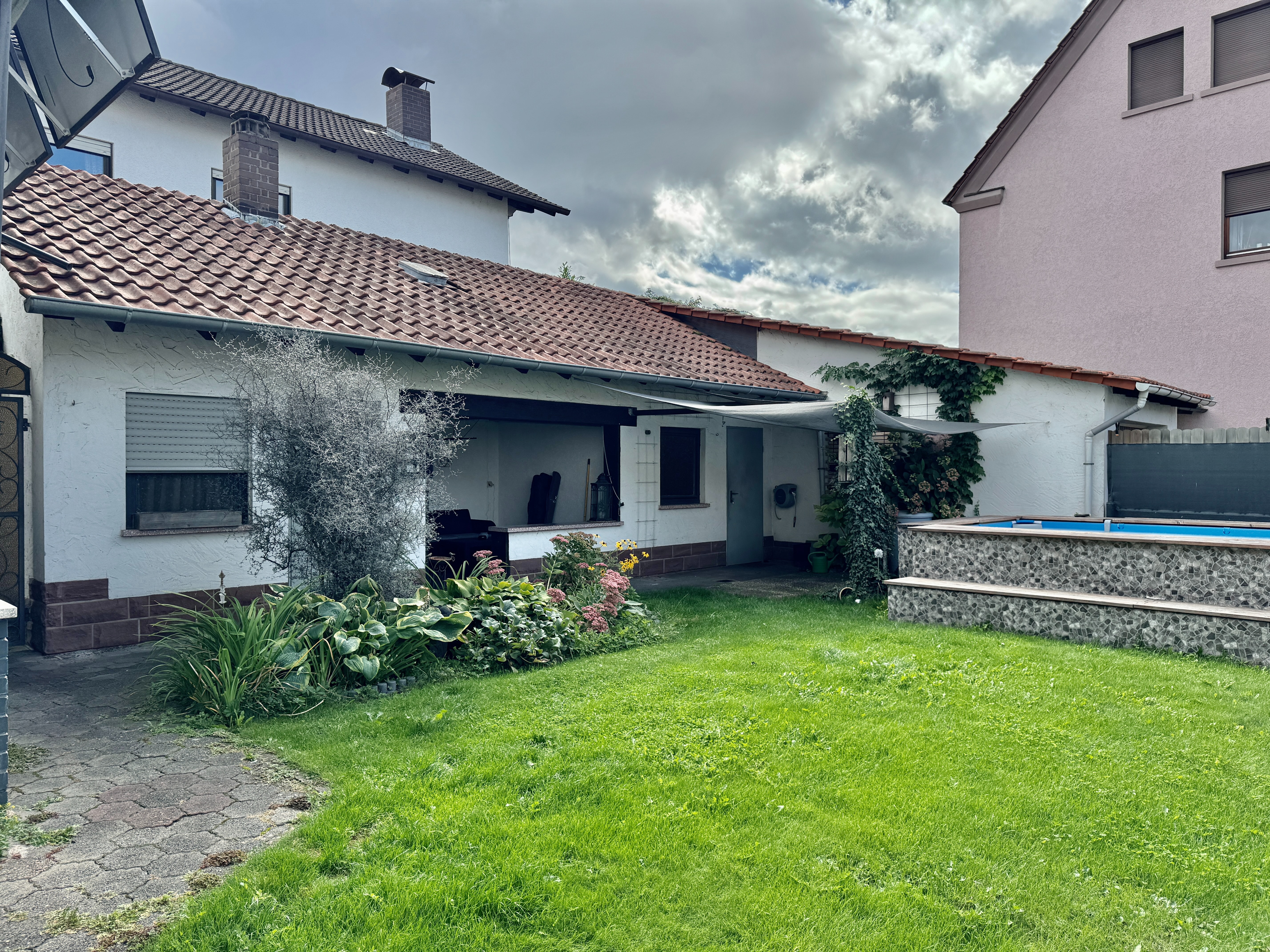 Freisitz, Außen-WC, verkleideter Frame-Pool im Garten