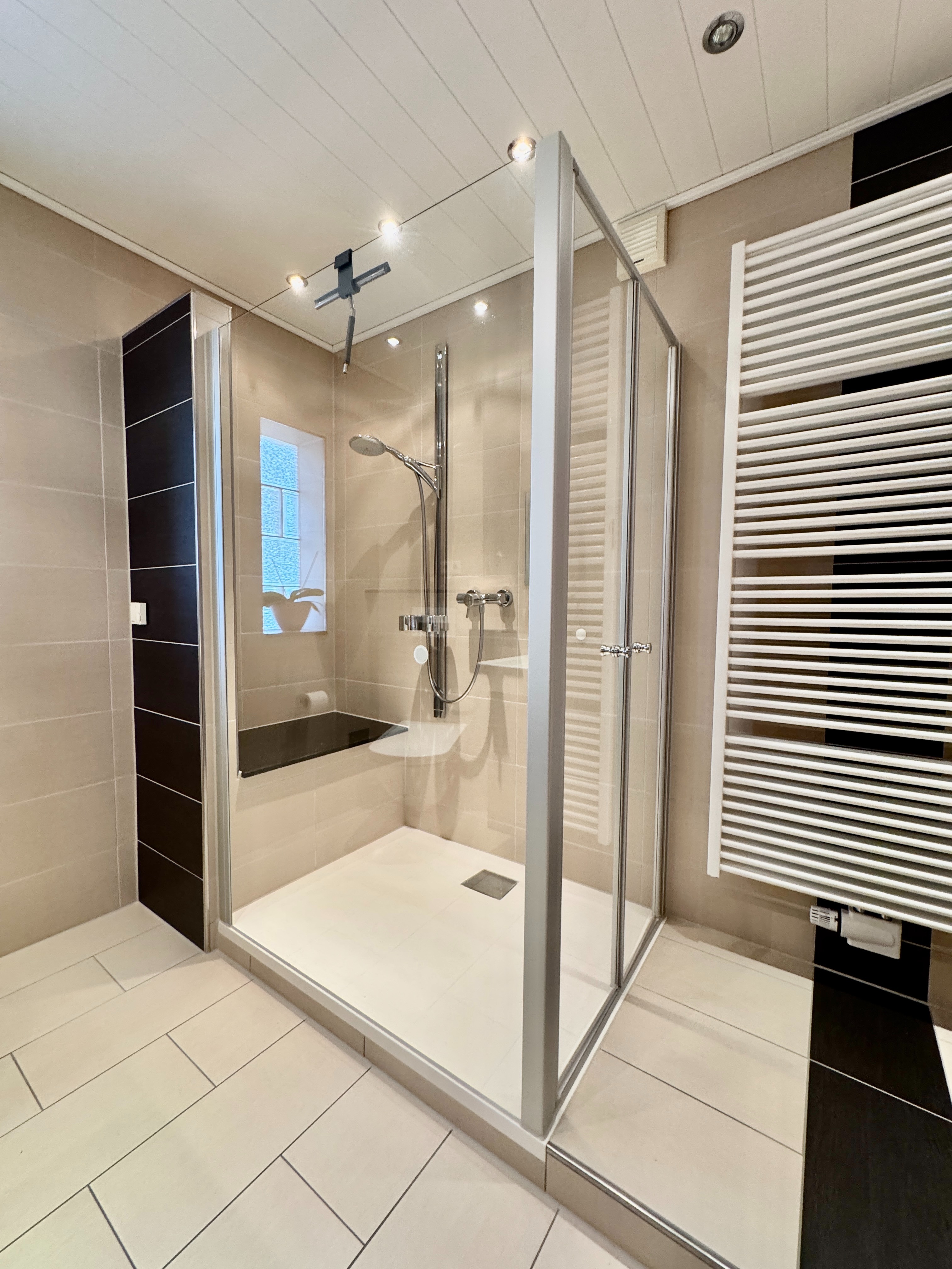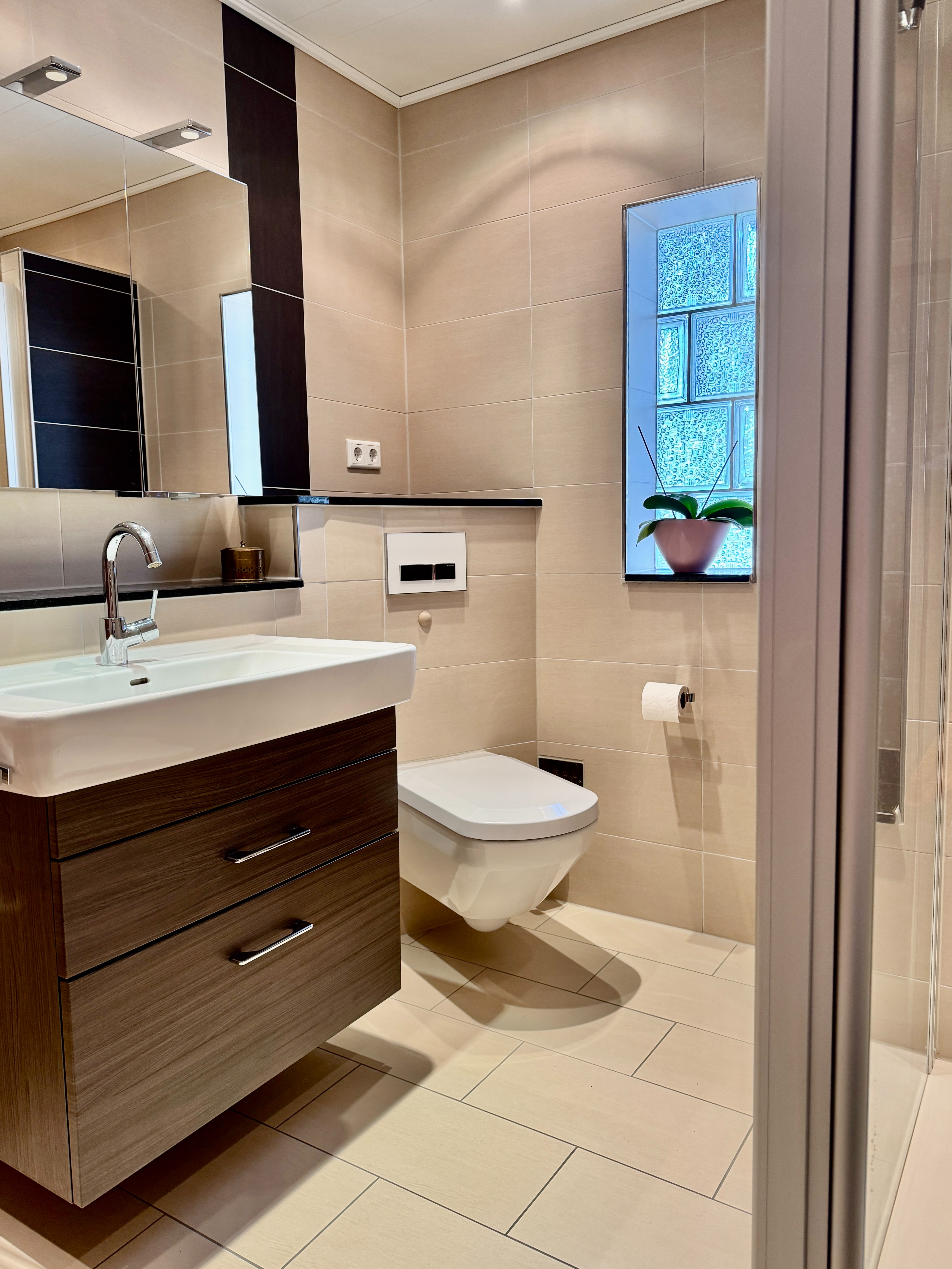 Die Einliegerwohnung (ca. 85,8 m²) verfügt über einen separaten Zugang: Flur, Küche mit Einbauküche, Dusch- / Wannenbad, Schlafzimmer und ein Wohnzimmer mit direktem Zugang auf die Terrasse. Sie eignet sich hervorragend für erwachsene Kinder, Pflegekräfte, Büro oder als vermietbare Einheit zur Entlastung der Wohnkosten.