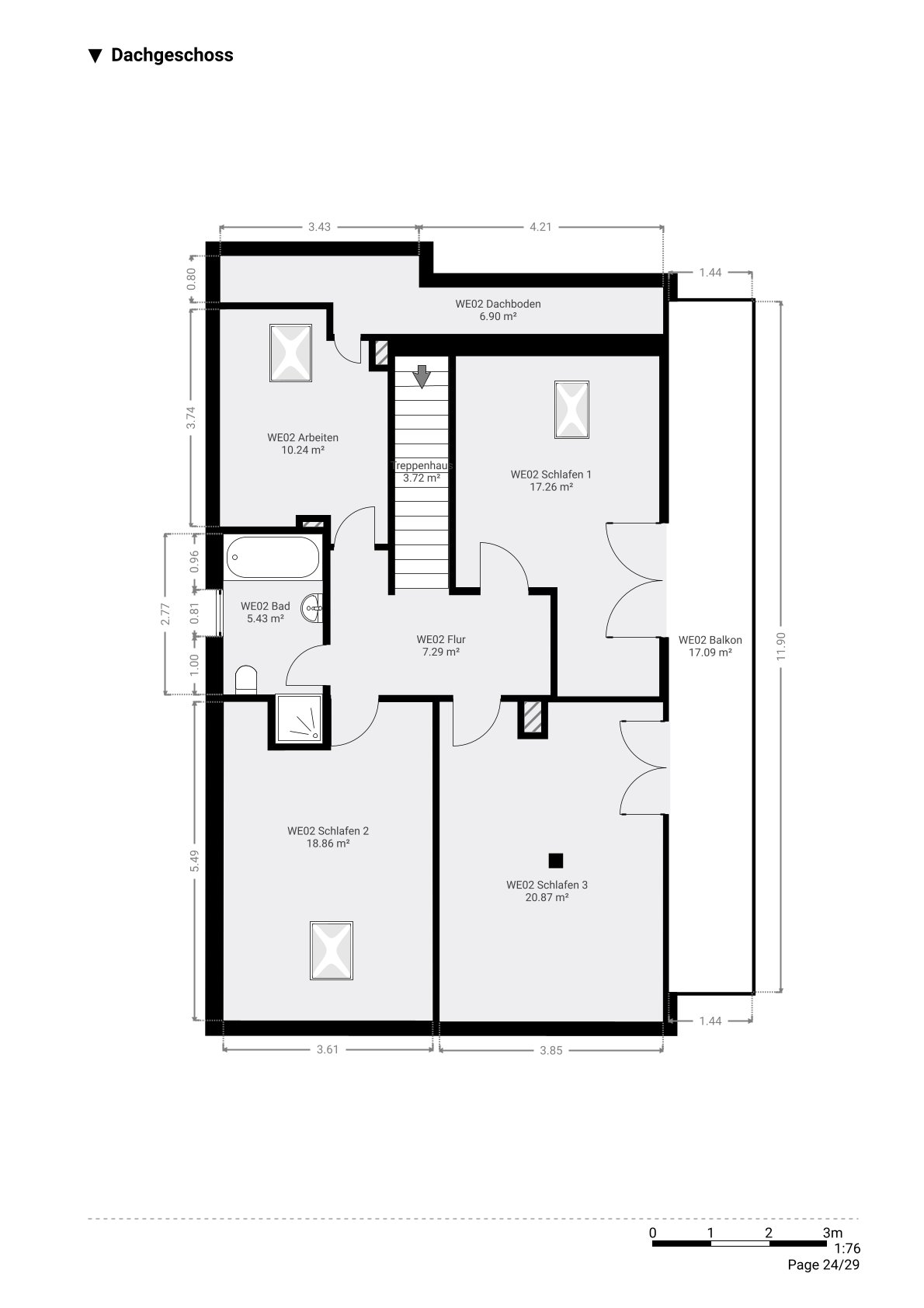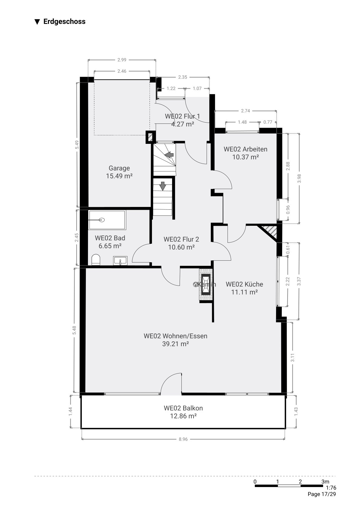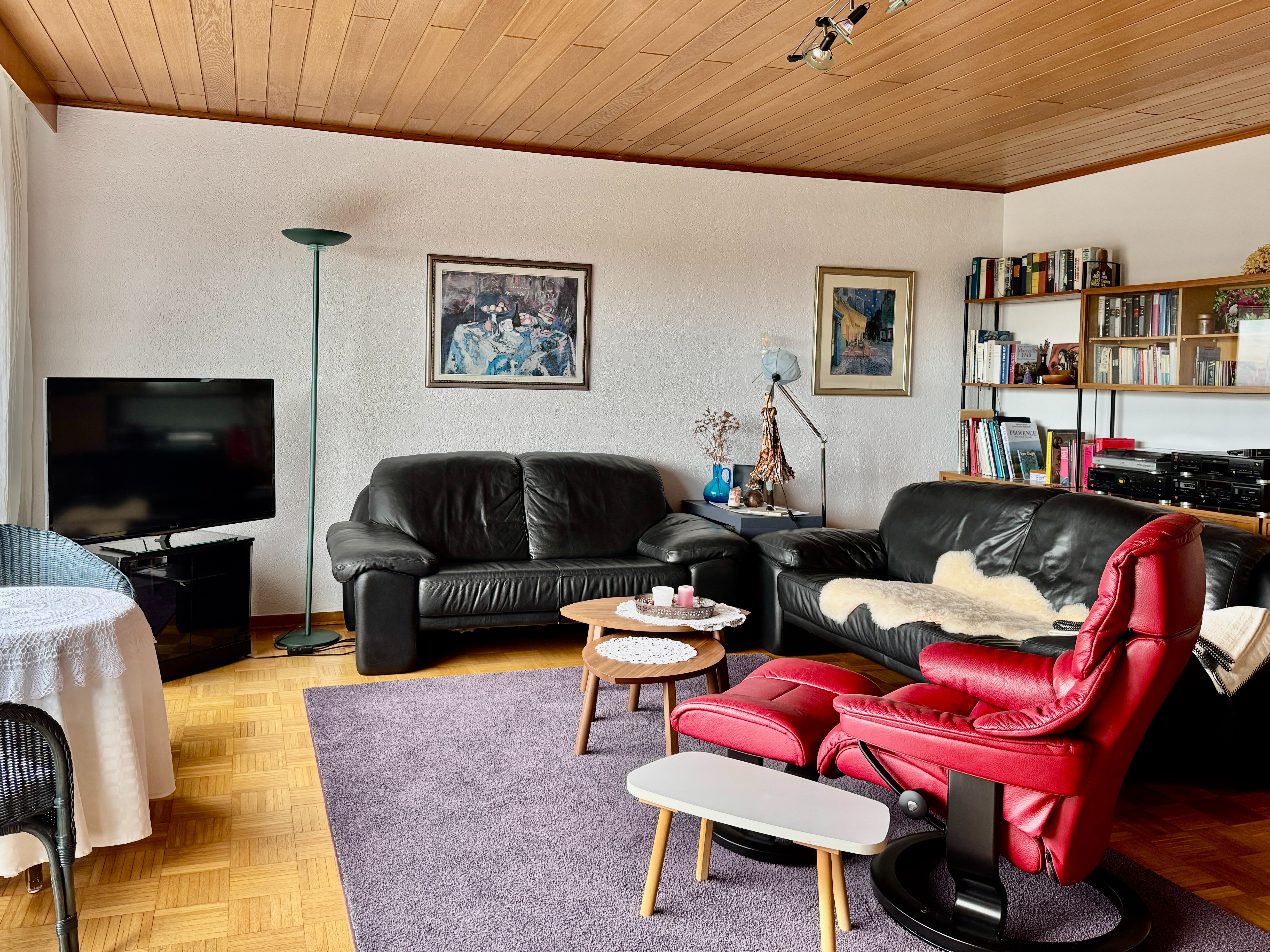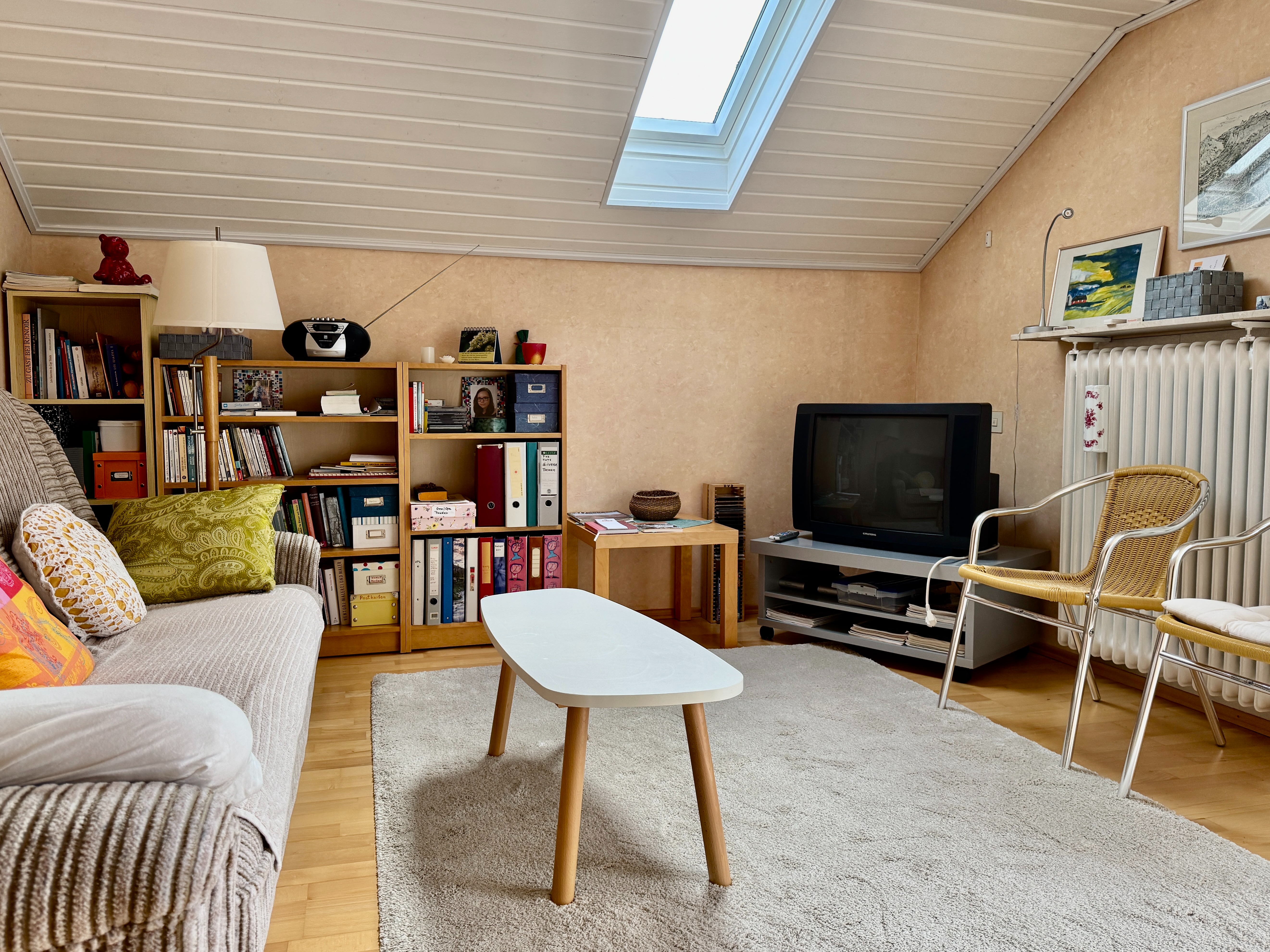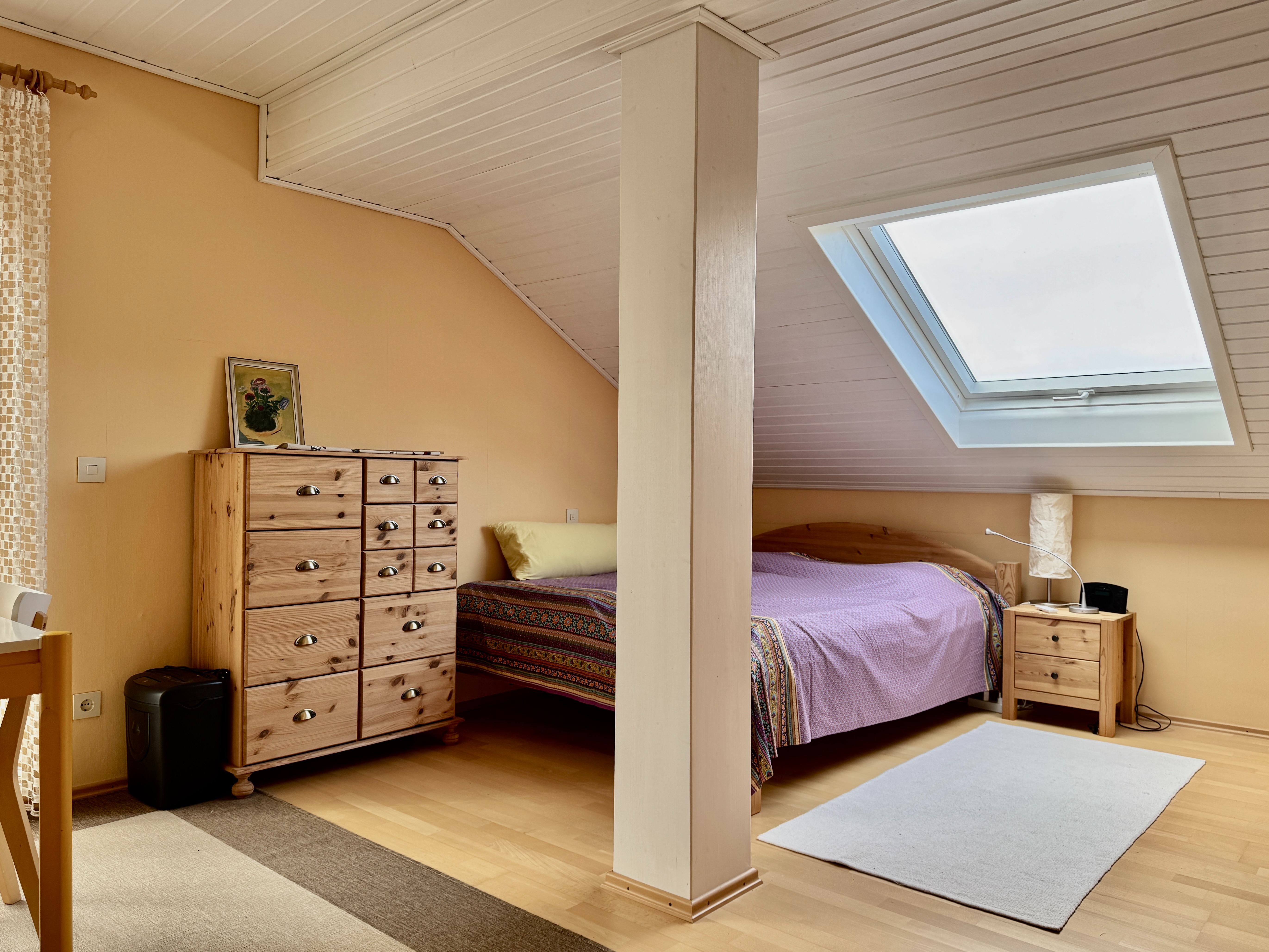 Die Hauptwohnung erstreckt sich über Erd- und Dachgeschoss und umfasst ca. 167,4 m² Wohnfläche zuzüglich Balkon im EG. Im Erdgeschoss bilden das großzügige Wohn-/Esszimmer mit Kamin (Baujahr 2009), die Küche mit Einbauküche und ein separates Büro das Herzstück des Alltags. Das Duschbad wurde in 2013 erneuert und präsentiert sich modern und funktional. Der westlich ausgerichtete Balkon mit freiem Weitblick erweitert den Wohnraum ins Grüne. Eine Holztreppe führt ins Dachgeschoss mit 3,5 Zimmern, einem Dusch- / Wannenbad aus Baujahr und der geschützten, südlich ausgerichteten Loggia – ein stiller Rückzugsort zu jeder Jahreszeit. Parkett- und Fliesenböden sorgen für wertige Haptik; Rollläden (teilweise elektrisch) erhöhen Komfort und Privatsphäre. Der Spitzboden bietet zusätzliche Abstellmöglichkeiten.