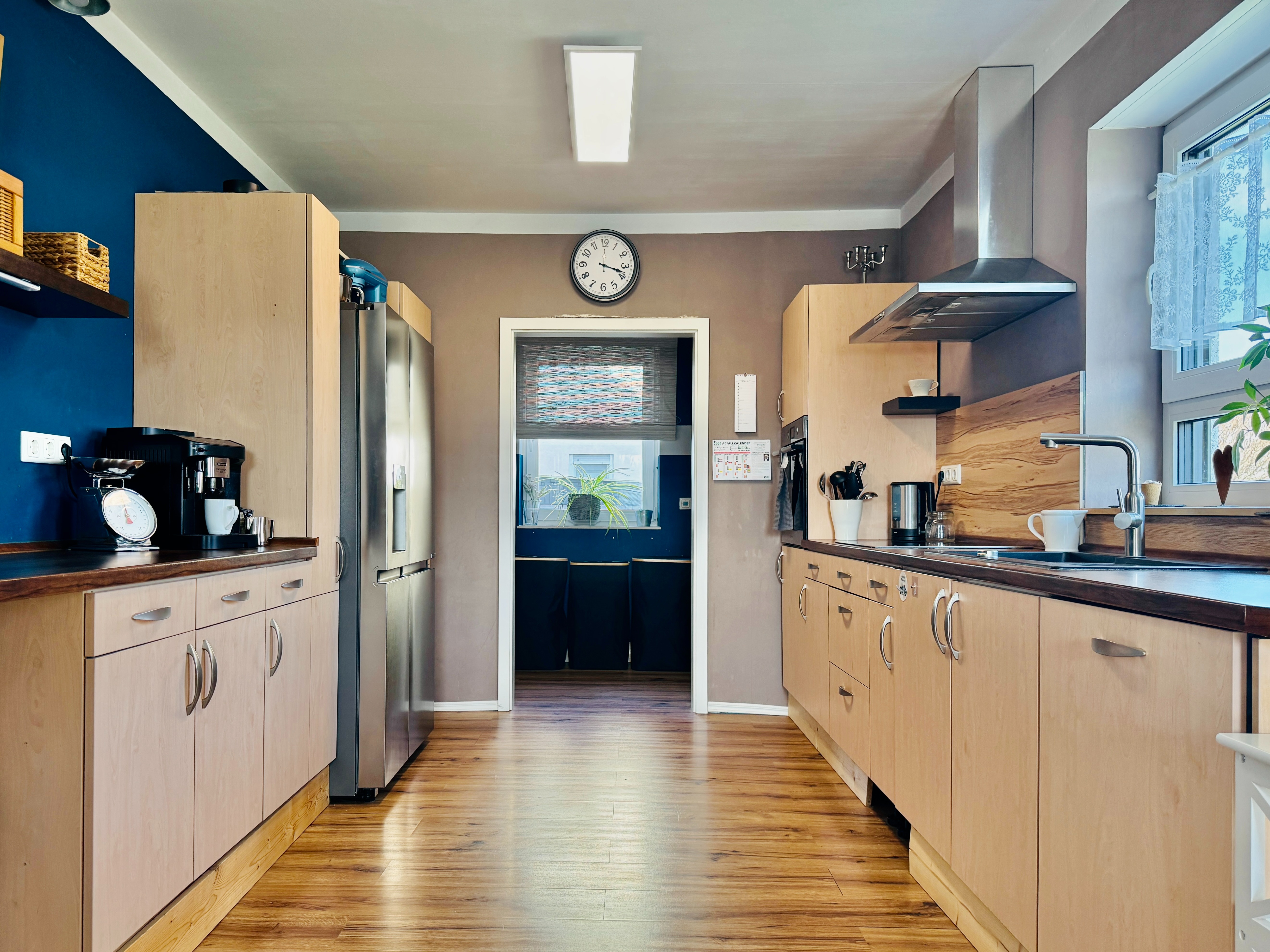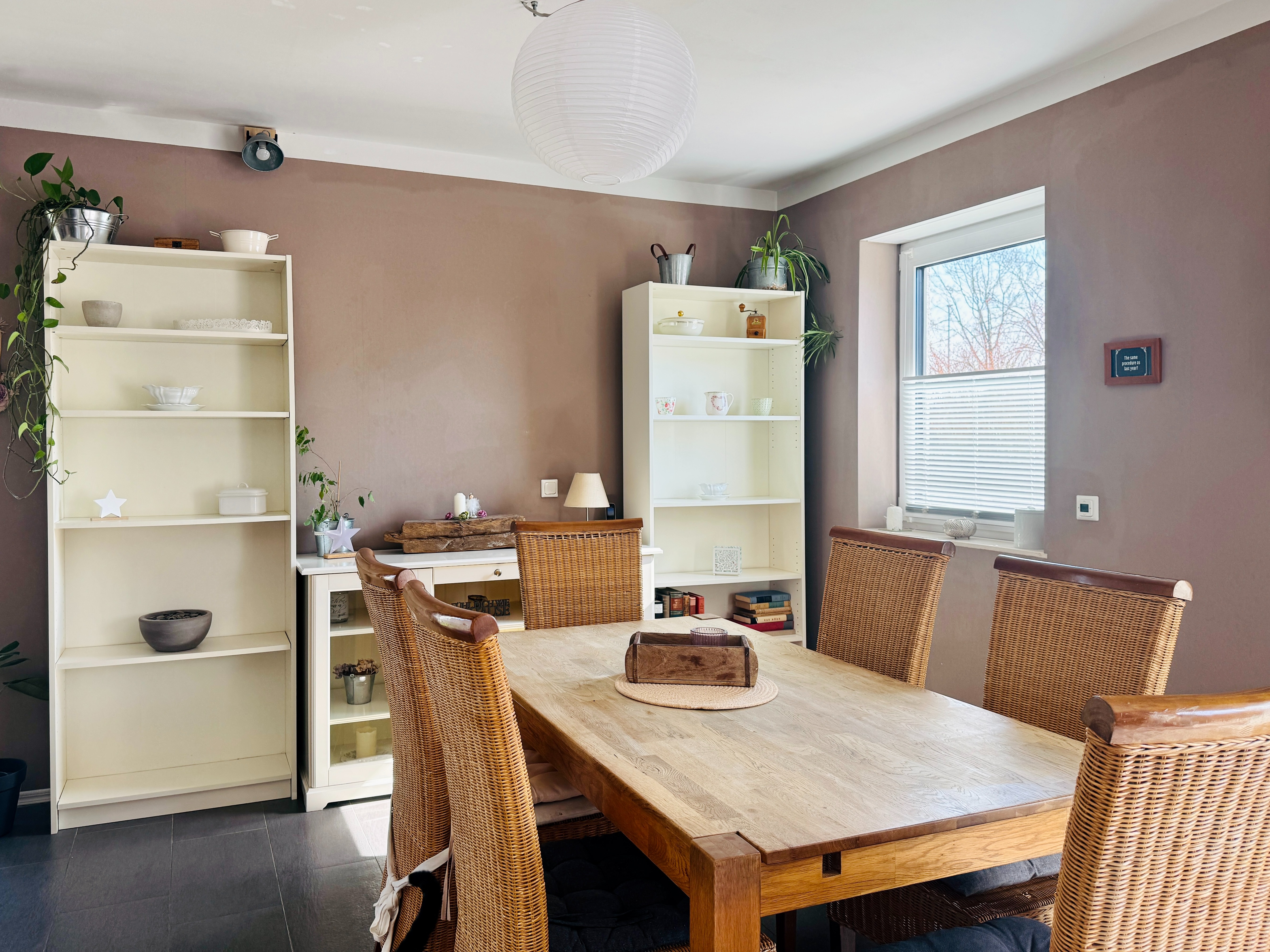 Im Erdgeschoss spielt sich der Familienalltag dort ab, wo es am schönsten ist: im offenen Wohn-/Ess-/Küchenbereich – hell, großzügig und mit direktem Zugang zur südlich ausgerichteten Terrasse und in den Garten. Hier wird gefrühstückt, gelacht, gespielt und gegrillt – und wenn die Sonne langsam tiefer steht, fühlt sich der Feierabend plötzlich leicht an. Direkt an die Küche schließt ein praktischer Abstellraum an – ideal für Vorräte, Getränkekisten, Küchenmaschine und alles, was man schnell griffbereit haben möchte, aber nicht sehen muss.