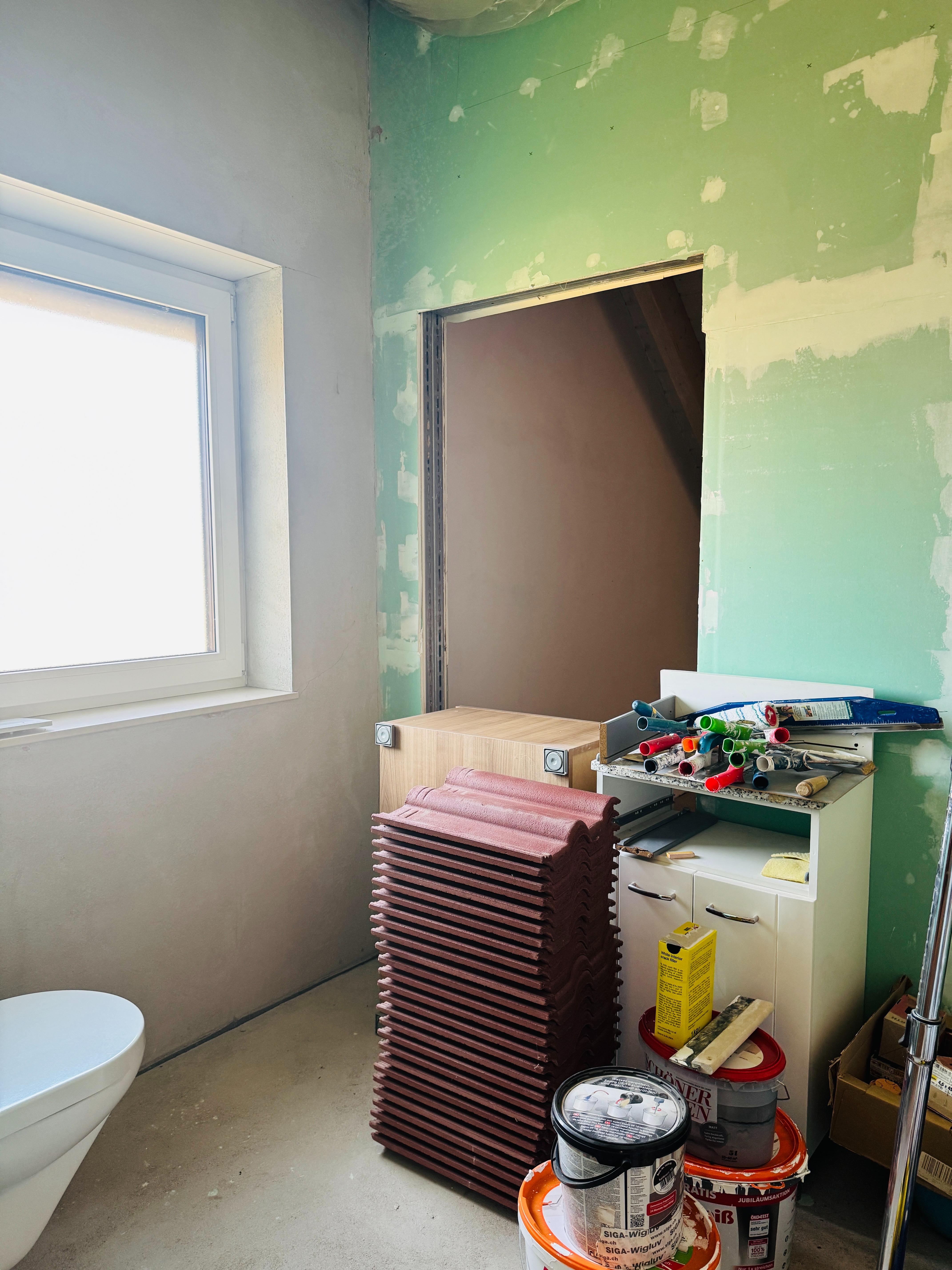 Ebenfalls im Erdgeschoss: ein Büro (perfekt für Homeoffice oder als Gästezimmer) sowie ein Tageslicht-Duschbad, das noch fertiggestellt werden muss – ideal als Gästebad oder für das schnelle Familienleben. Ergänzt wird diese Ebene durch den Technikraum, der die Haustechnik ordentlich bündelt und zusätzlichen Stauraum ermöglicht. Glasfaser wurde bereits ins Haus verlegt. Auch hier sind Sie gut für die Zukunft aufgestellt.