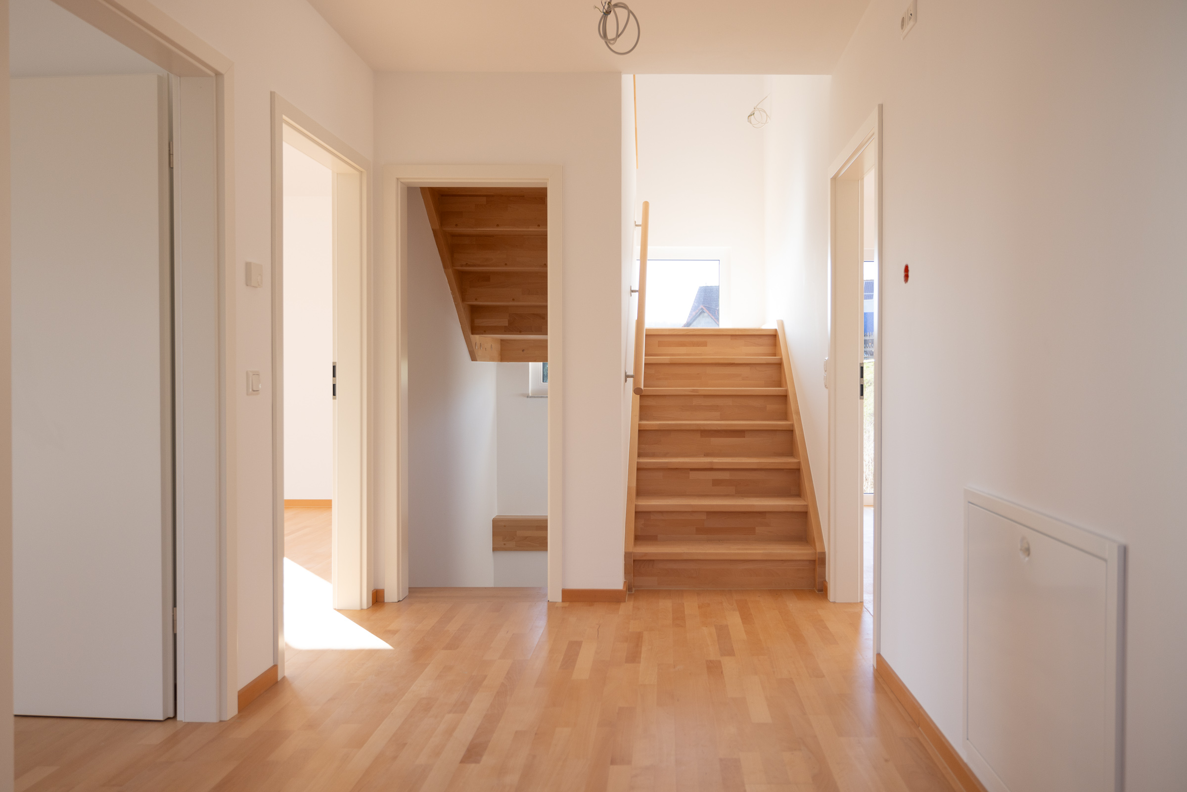 Im Untergeschoss befinden sich der Technik- und Hauswirtschaftsraum sowie ein heller, vielseitig nutzbarer Raum mit direktem Zugang ins Freie. Dieser Bereich ist noch nicht final ausgebaut – Material ist bereits teilweise vorhanden und im Kaufpreis enthalten.