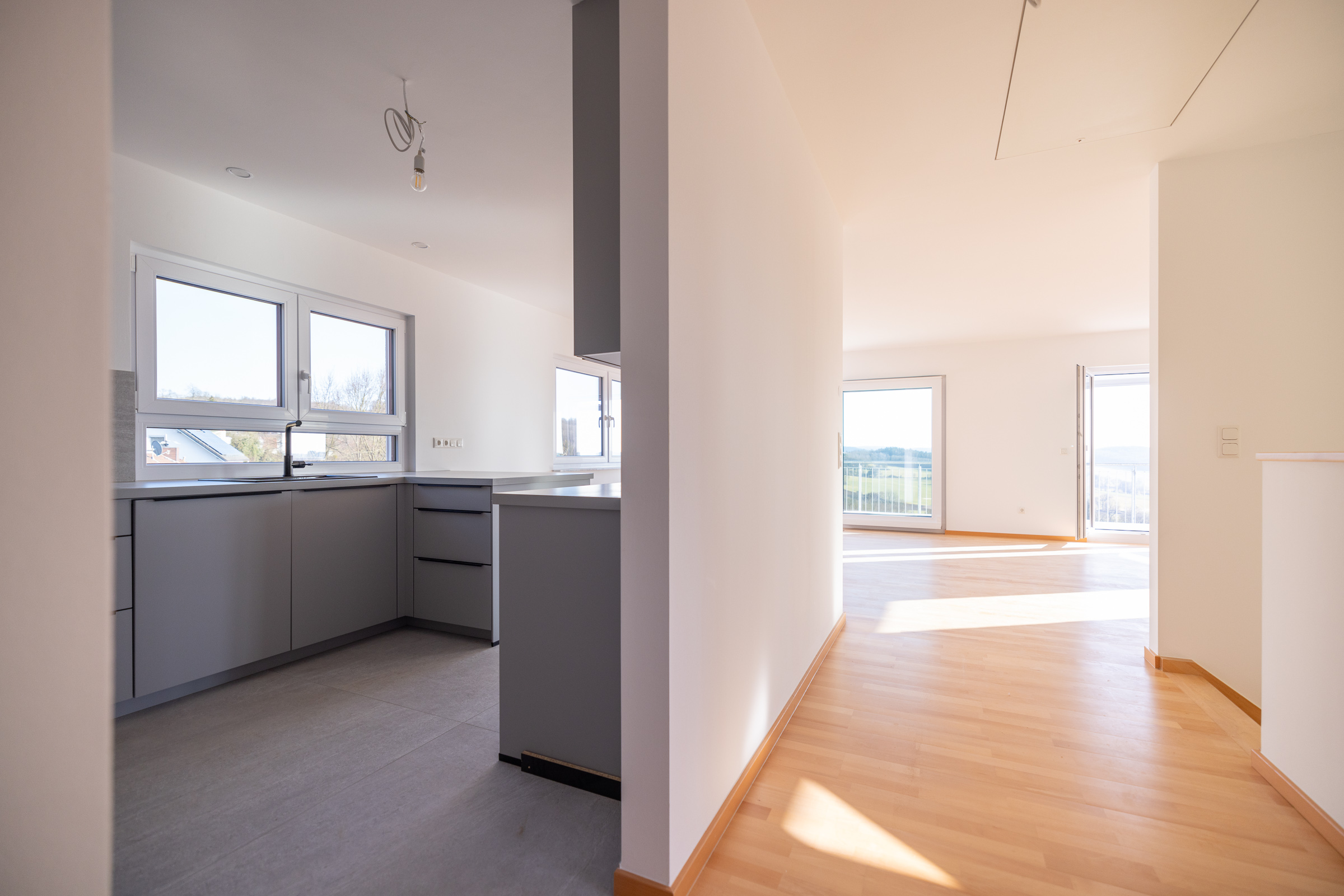 Edel anmutende HARO-Parkettböden, großformatige 100 × 100 cm-Fliesen, elektrische Rollläden und dreifach verglaste Sicherheitsfenster schaffen eine ruhige, wertige Atmosphäre.