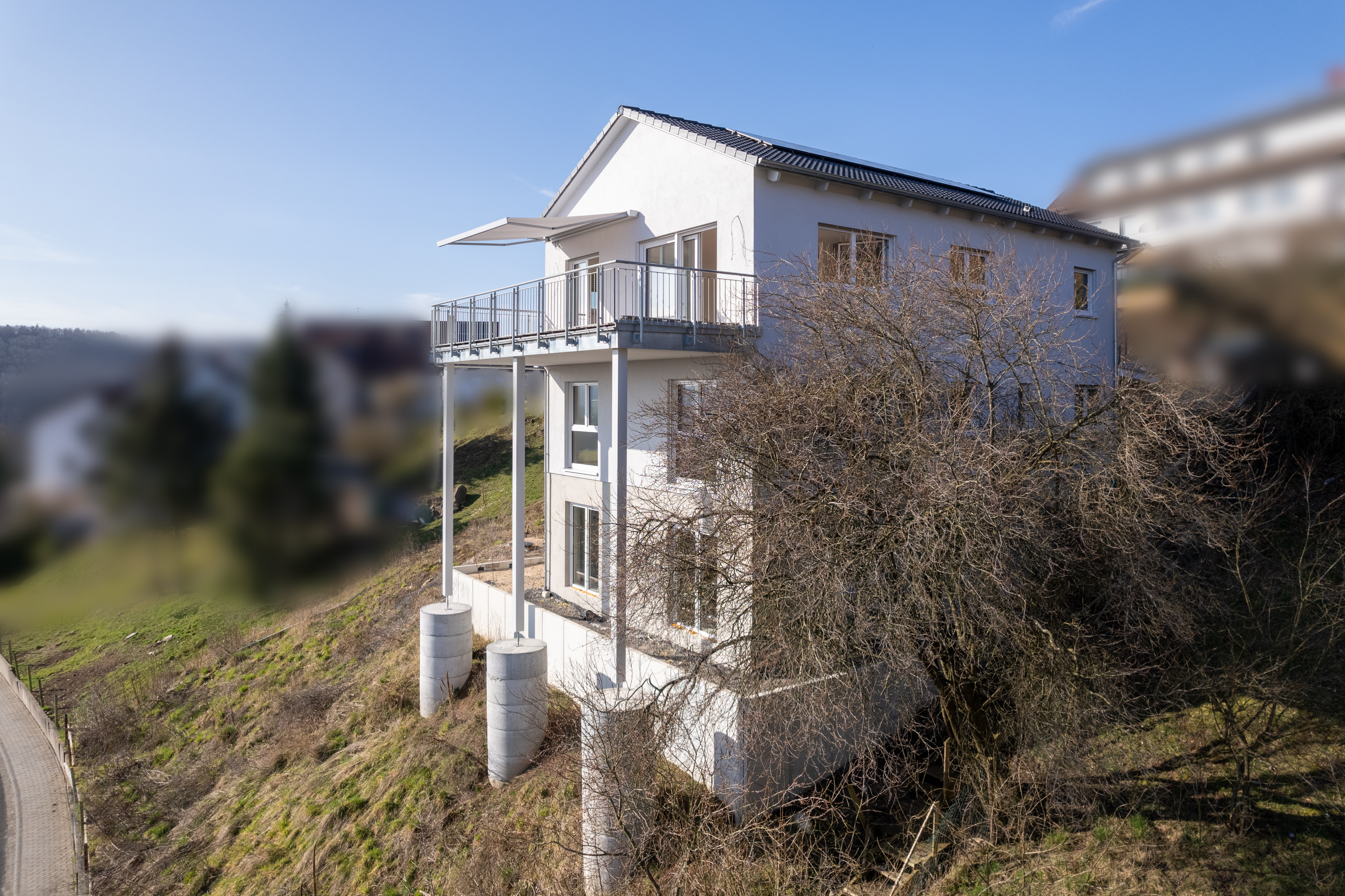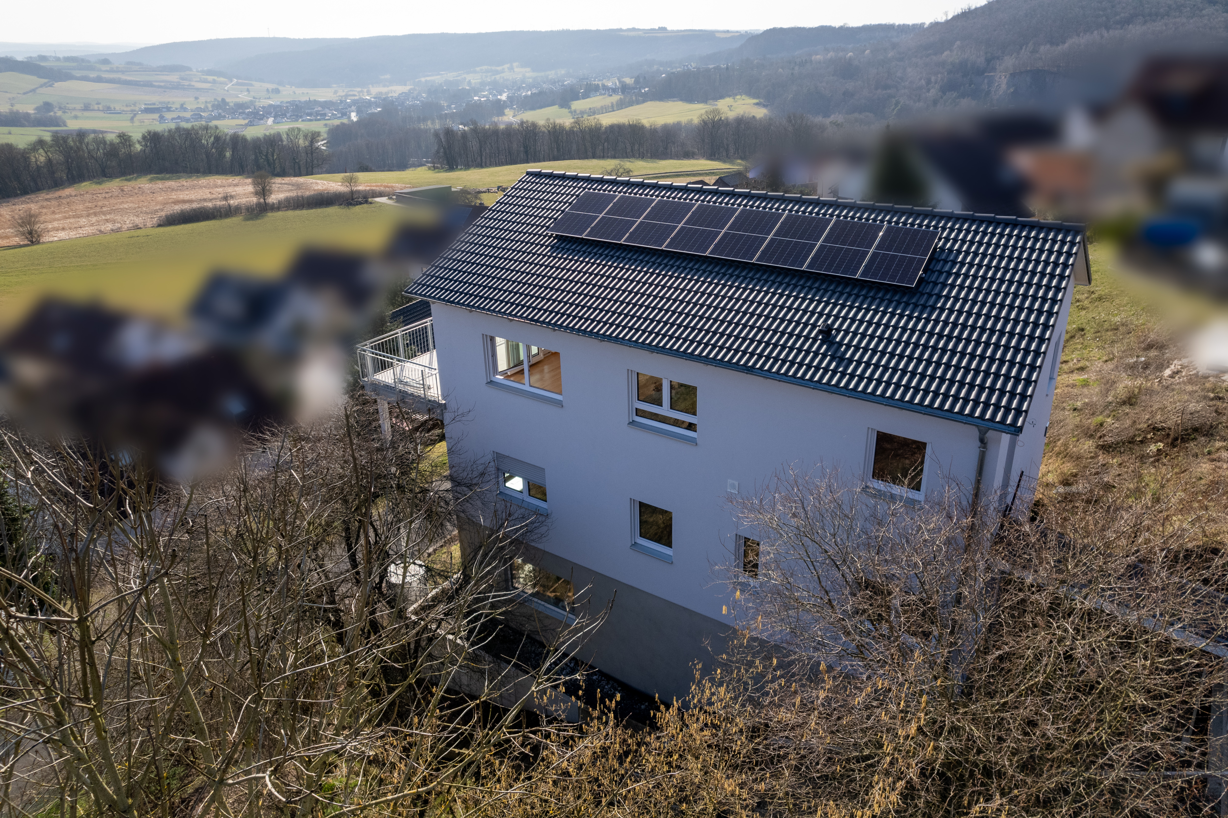 Die Immobilie wurde auf einem rund 682 m² großen Hanggrundstück erbaut und öffnet sich mit großzügigen Fensterfronten im Erdgeschoss zur Weite des Tals – atemberaubender Blick inklusive! Die südwestlich ausgerichtete Terrasse wird ganz sicher schnell zu Ihrem Lieblingsplatz.