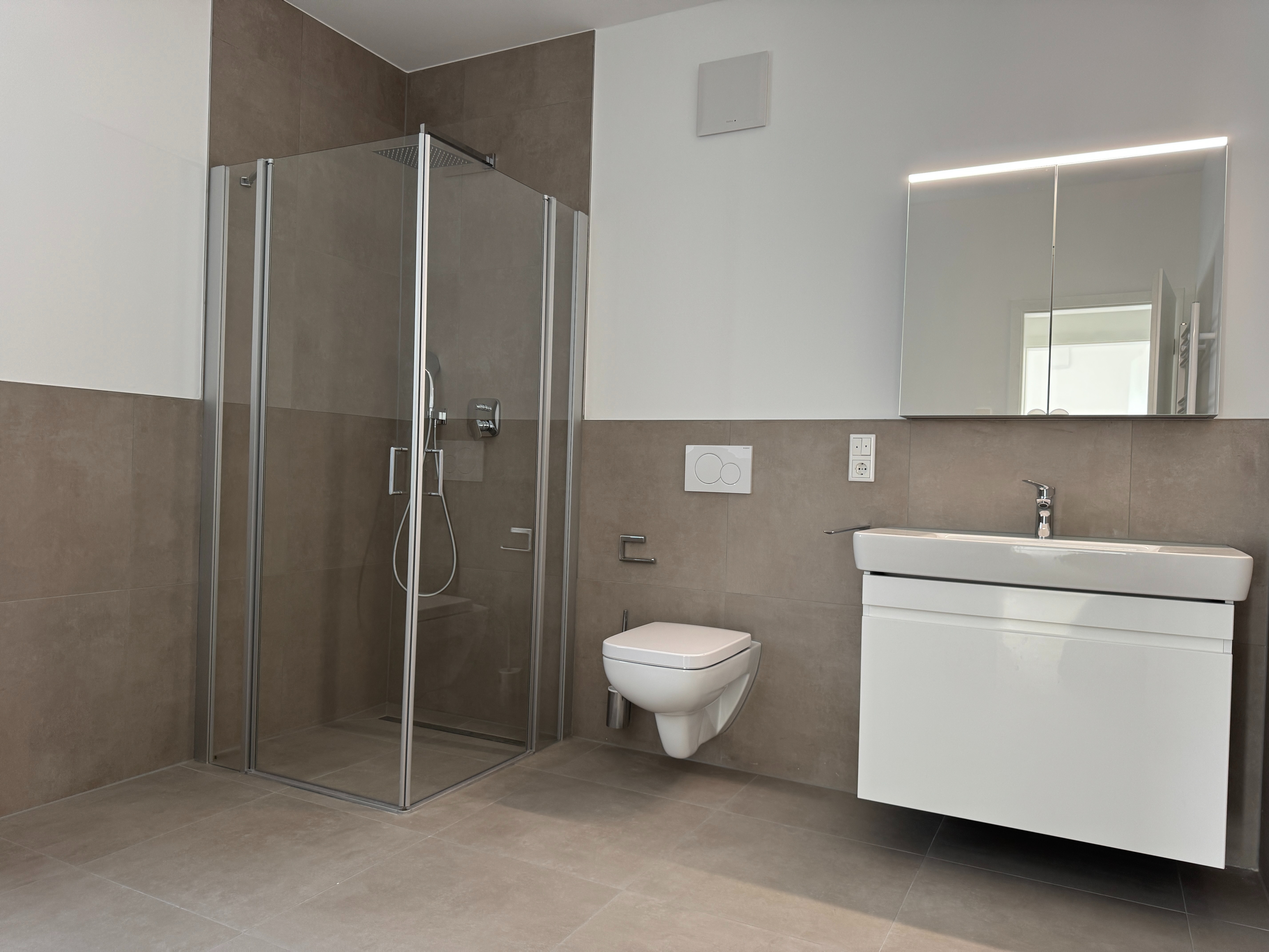 Das großzügige, elegante Masterbad, ausgestattet mit moderner, bodengleicher Dusche, hochwertigen Armaturen und einem zusätzlichen Handtuchheizkörper sowie Spiegel- und Unterschrank, strahlt pure Wohlfühlatmosphäre aus.