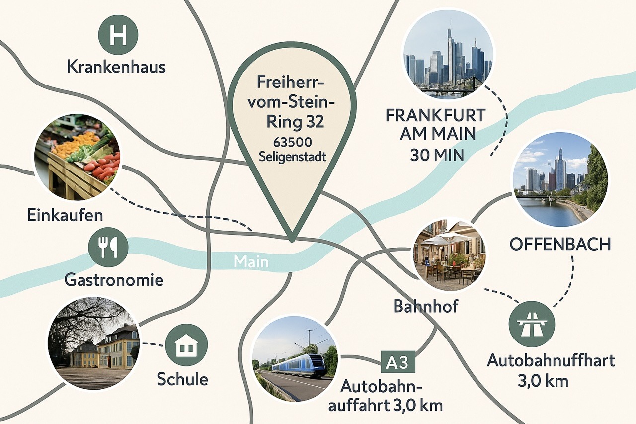 Für Pendler ist die Lage besonders attraktiv. Über die nahegelegene A3 und A45 erreichen Sie Frankfurt am Main, Offenbach oder Aschaffenburg in kurzer Zeit. Auch der öffentliche Nahverkehr ist hervorragend ausgebaut, sodass Sie bequem mit Bus oder Bahn mobil bleiben.
