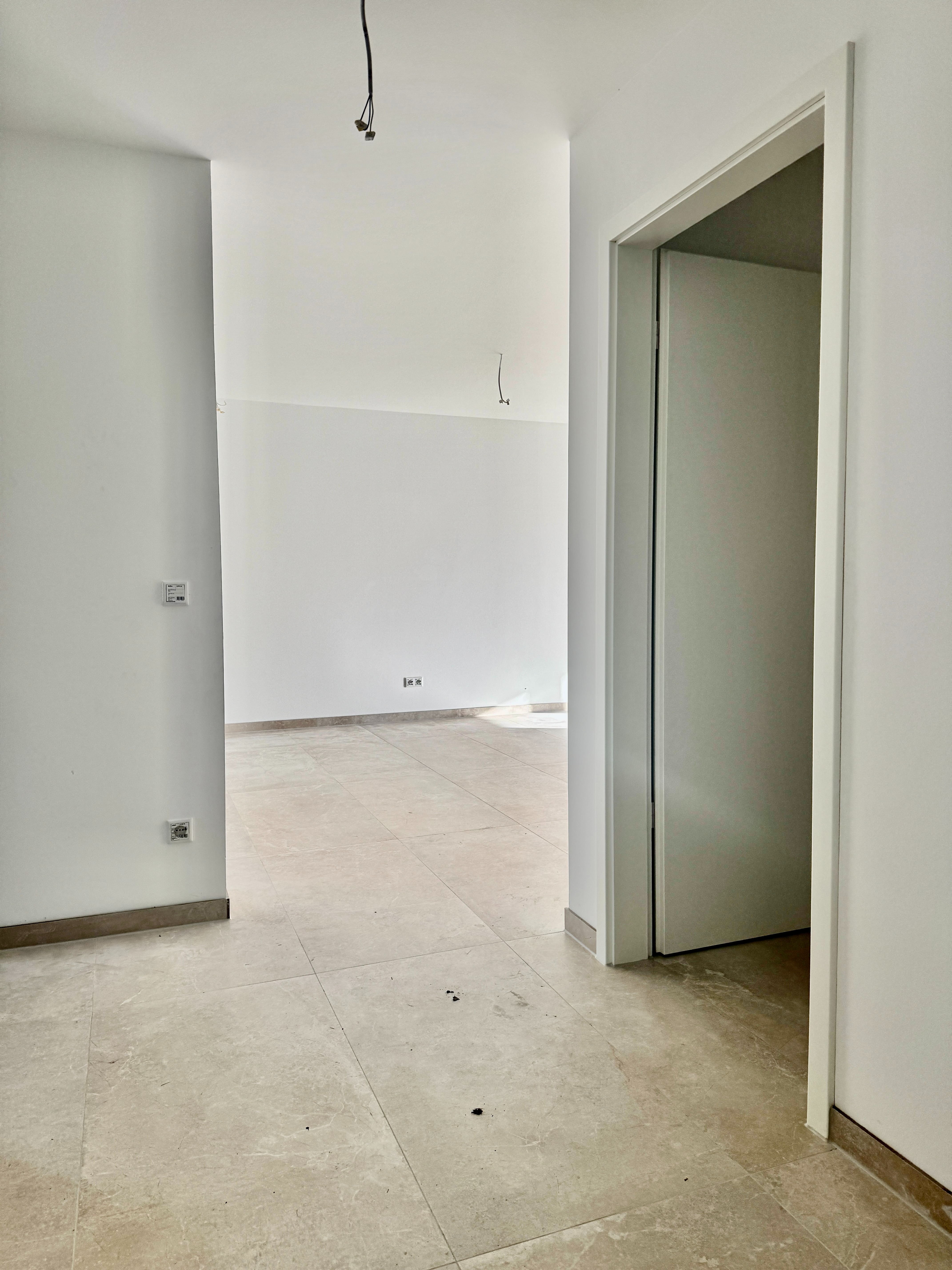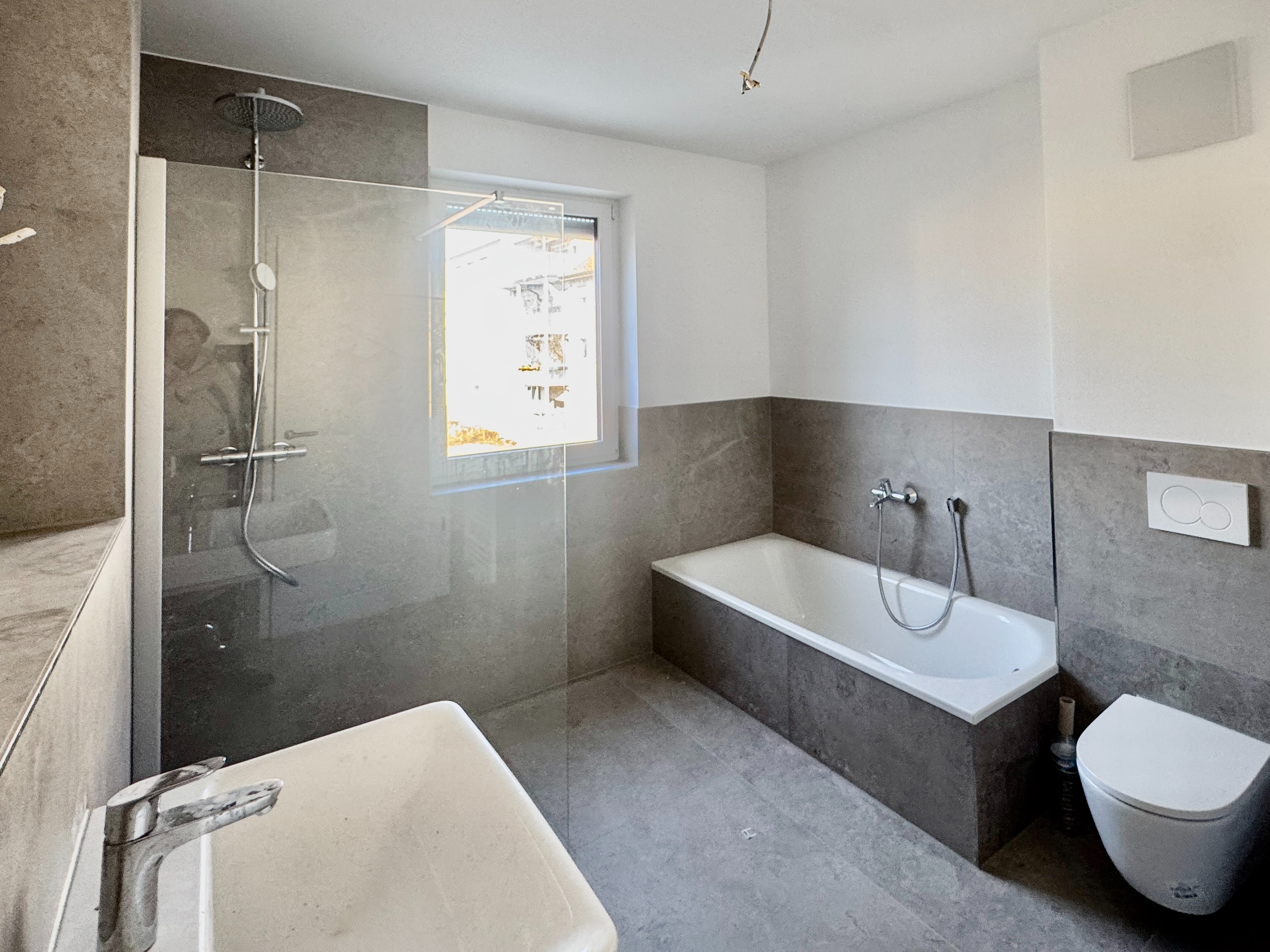 Auch bei der Ausstattung wurde konsequent auf Qualität gesetzt: Fußbodenheizung, effiziente Fernwärme, großformatige Fliesen (ca. 60 × 60 cm), Wände mit Malervlies, hochwertige Gira-Schalterserie sowie ein stilvolles Badkonzept – alles wirkt modern, klar und wertig.