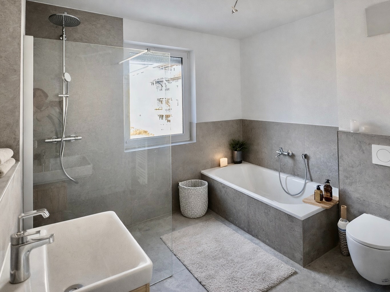 Bad mit Fenster, Badewanne und bodengleicher Dusche
