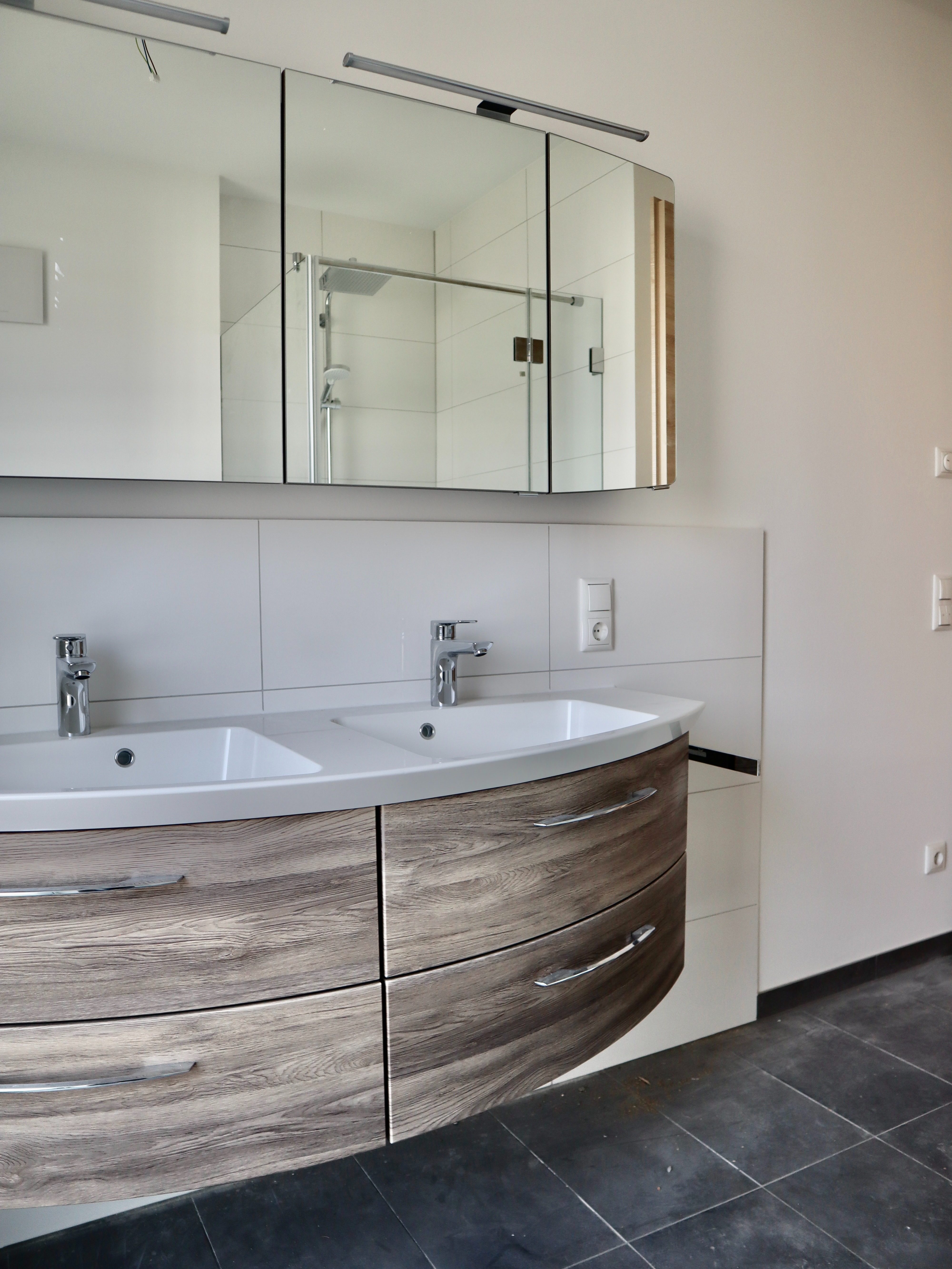 – Bad: Dusche, Doppelwaschtisch, Spiegelschrank, Handtuchheizkörper