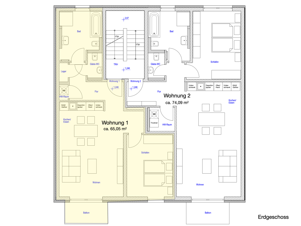 Im Objekt stehen darüber hinaus noch weitere Wohnungen von ca. 65 m² und ca. 74 m² verteilt auf zwei Zimmer zur Verfügung. Als erste Orientierung dienen Ihnen hier die ebenfalls im Exposé enthaltenen Grundrisse dieser Wohnungen.