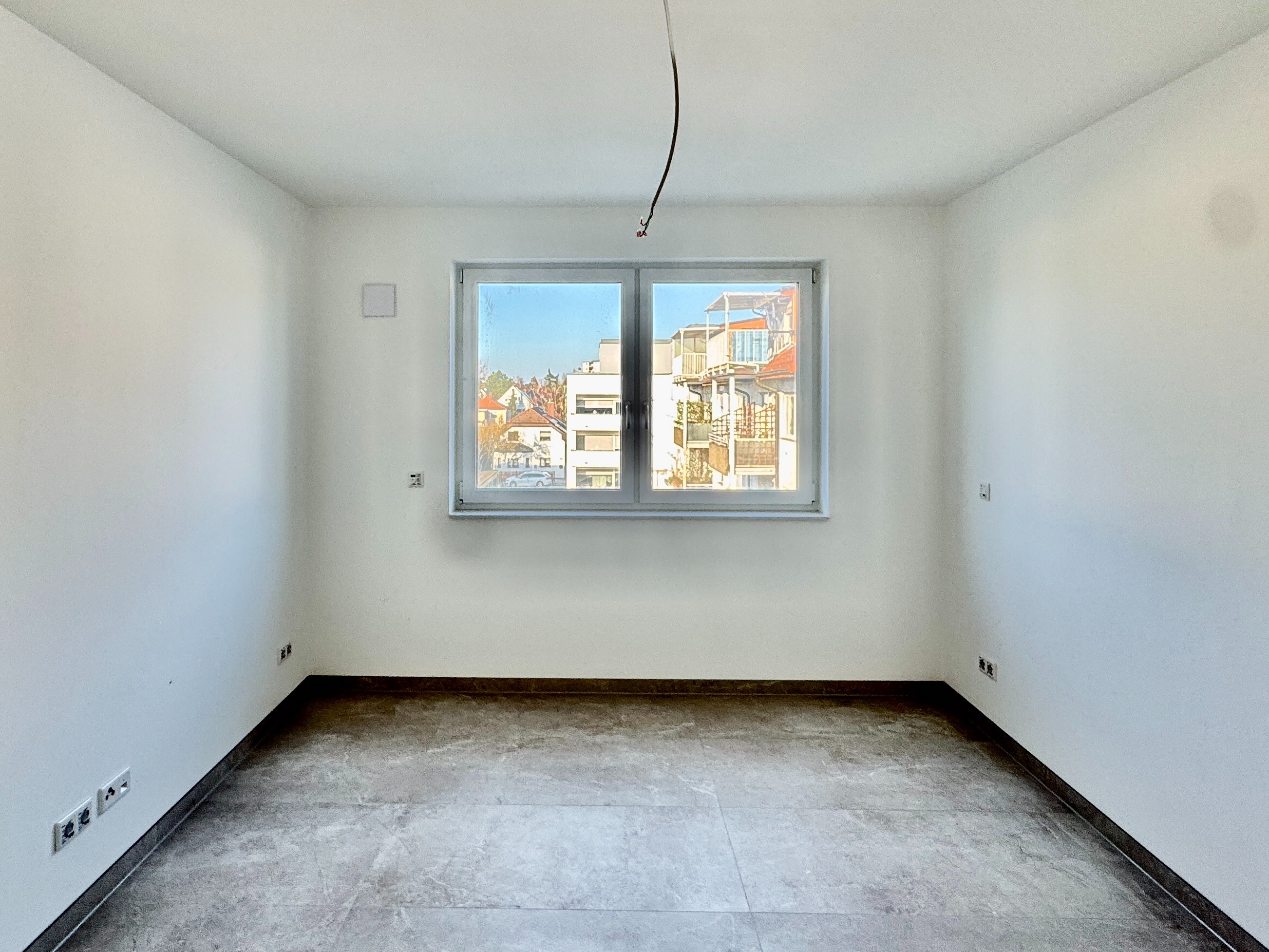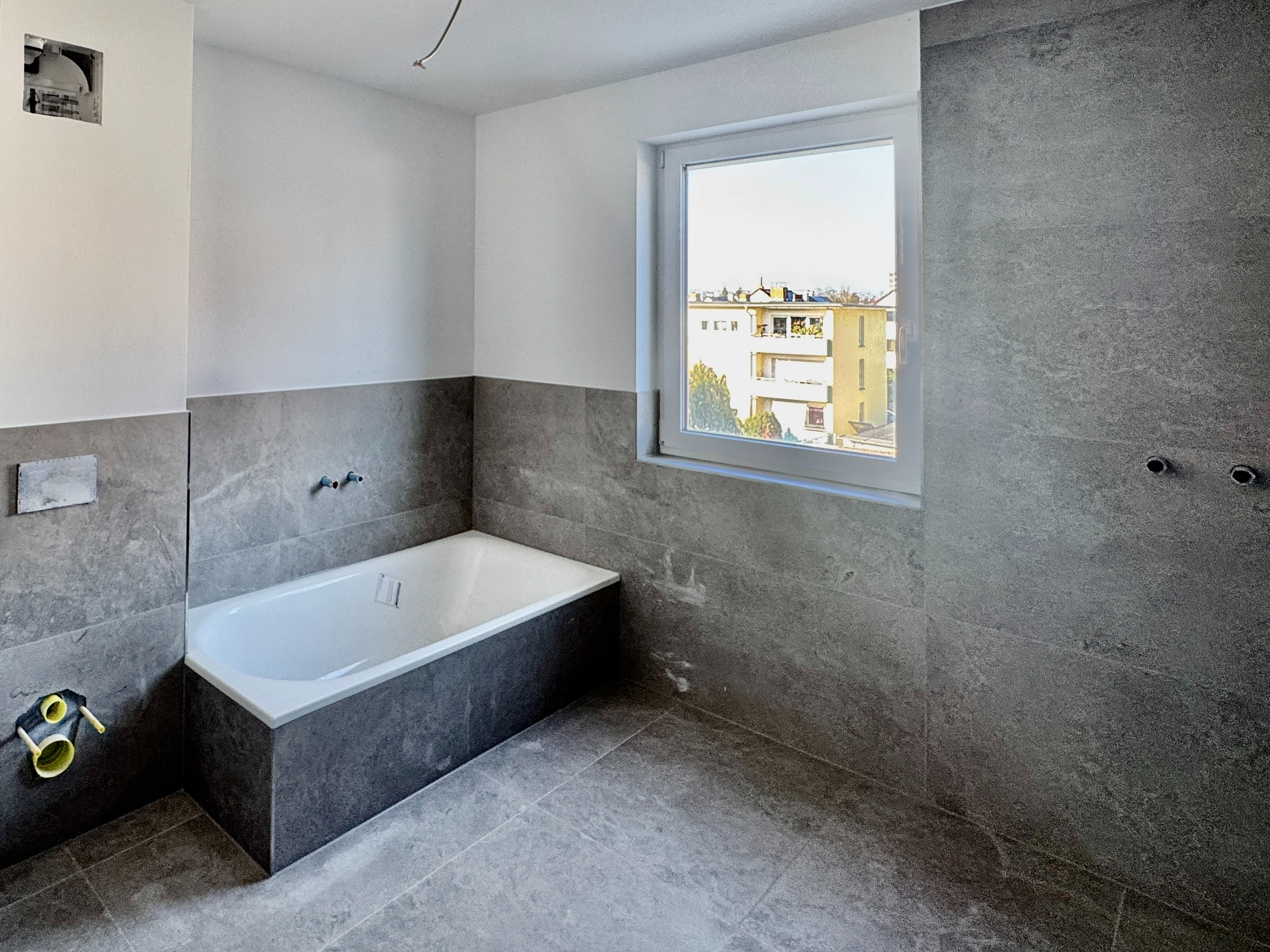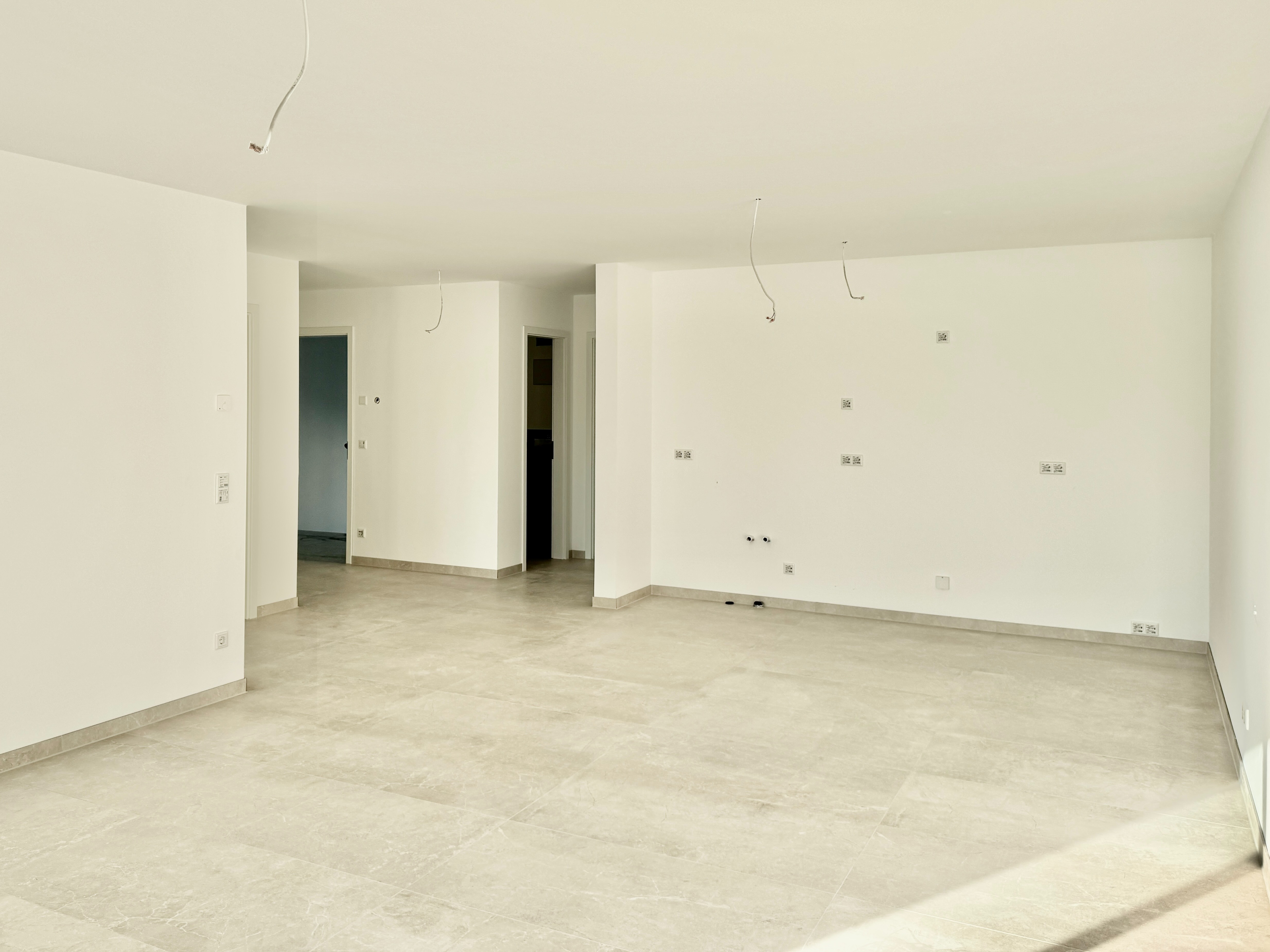 Auch bei der Ausstattung wurde konsequent auf Qualität gesetzt: Fußbodenheizung, effiziente Fernwärme, großformatige Fliesen (ca. 60 × 60 cm), Wände mit Malervlies, hochwertige Gira-Schalterserie sowie ein stilvolles Badkonzept – alles wirkt modern, klar und wertig.