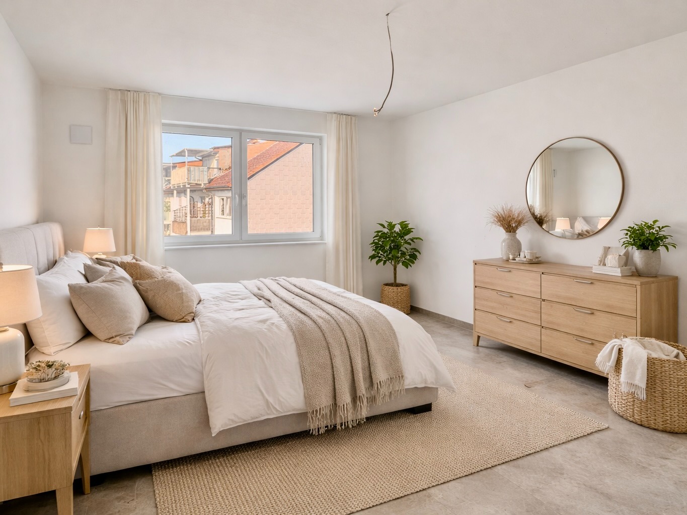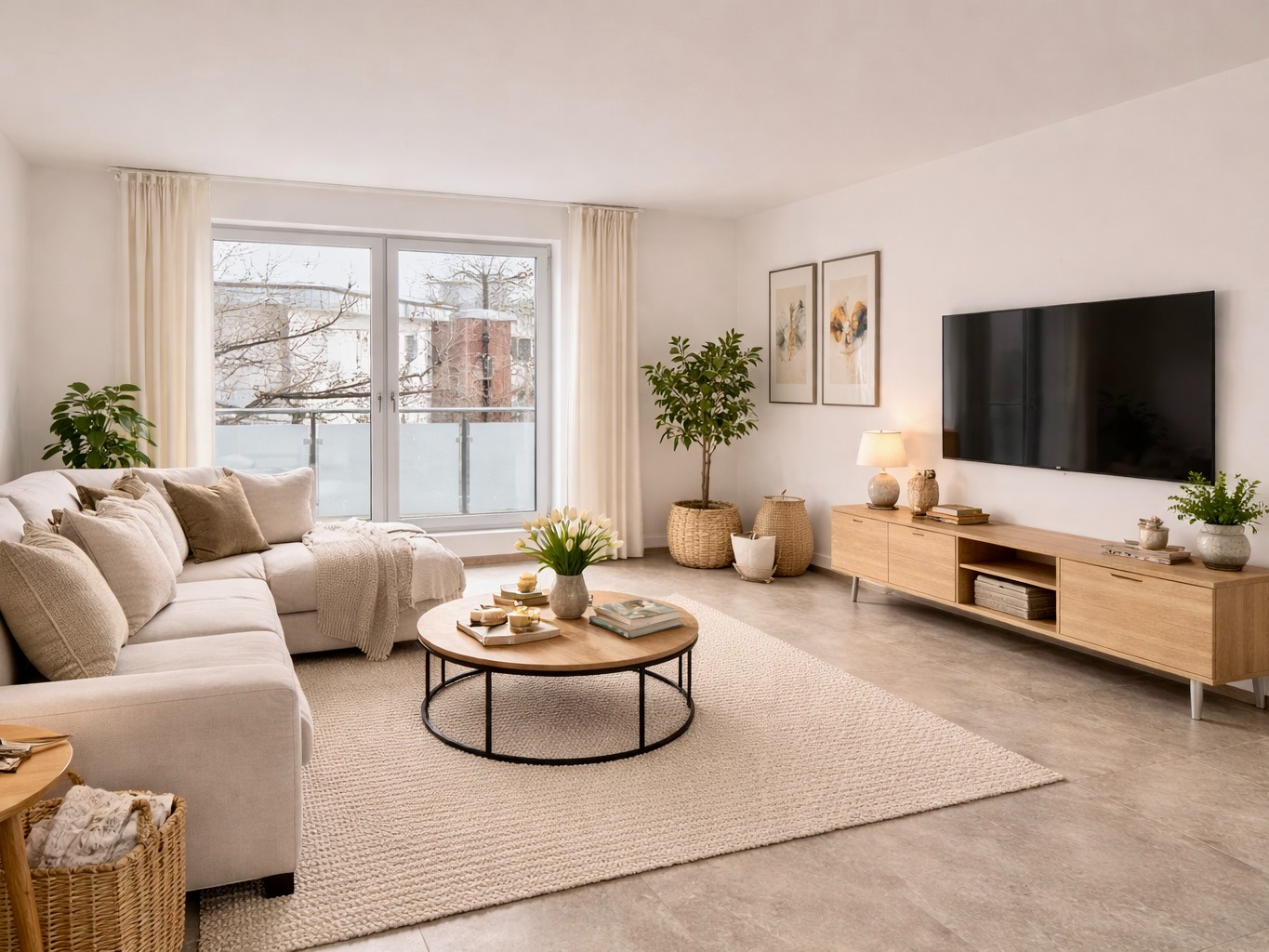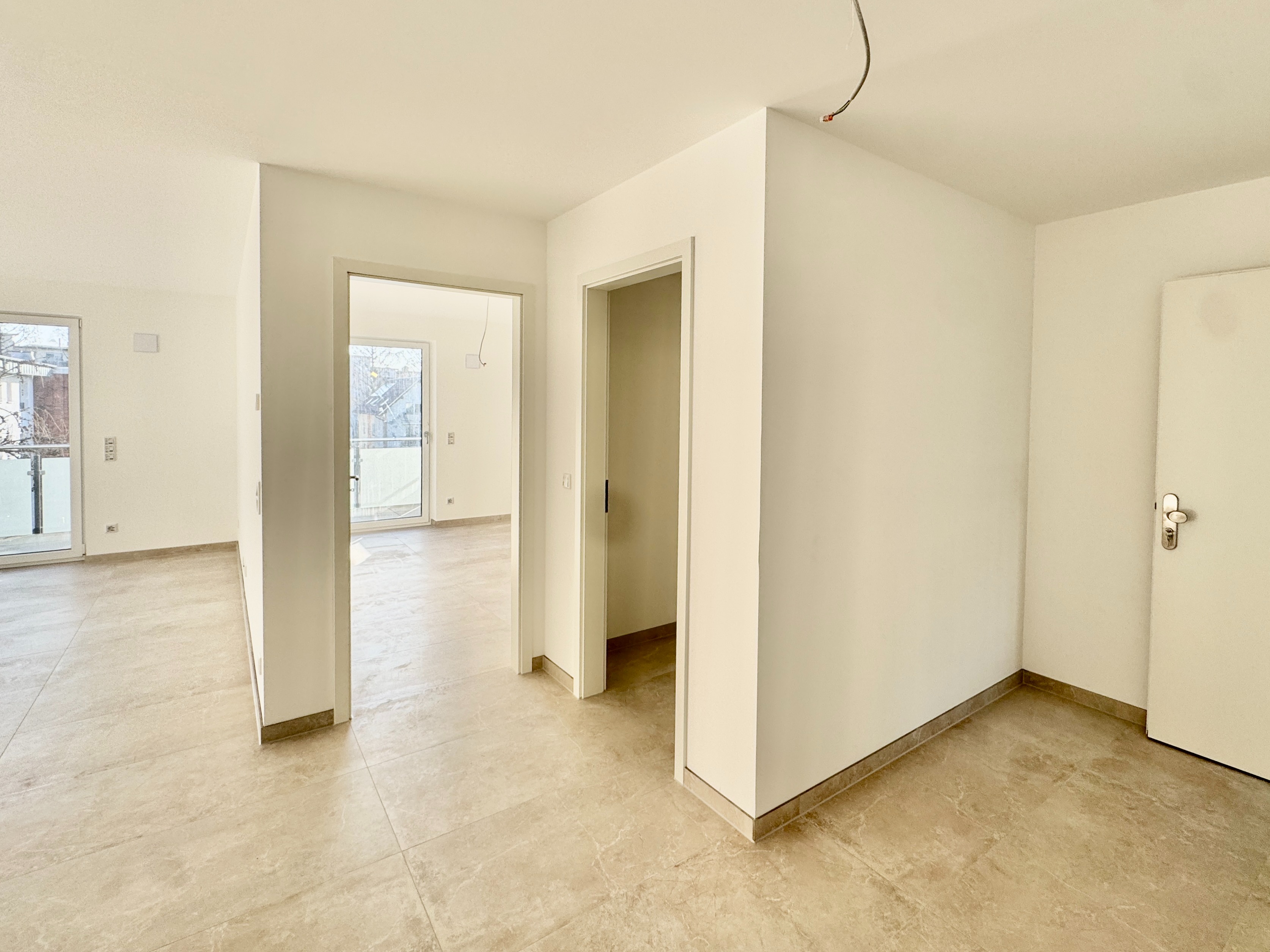Auch bei der Ausstattung wurde konsequent auf Qualität gesetzt: Fußbodenheizung, effiziente Fernwärme, großformatige Fliesen (ca. 60 × 60 cm), Wände mit Malervlies, hochwertige Gira-Schalterserie sowie ein stilvolles Badkonzept – alles wirkt modern, klar und wertig.
