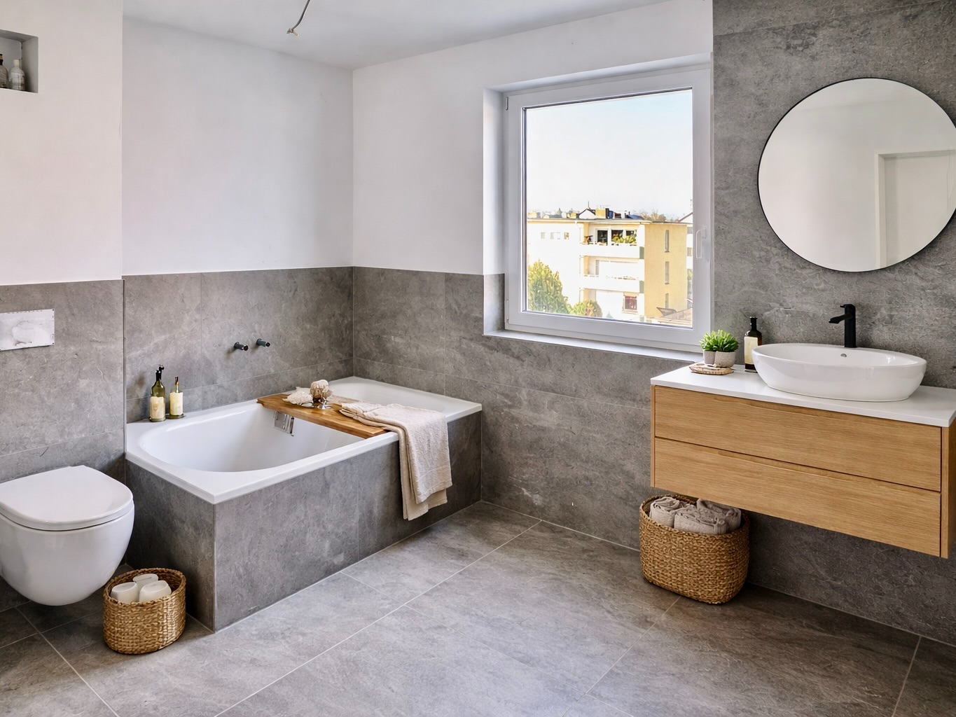 Bad mit Fenster, Badewanne und bodengleicher Dusche