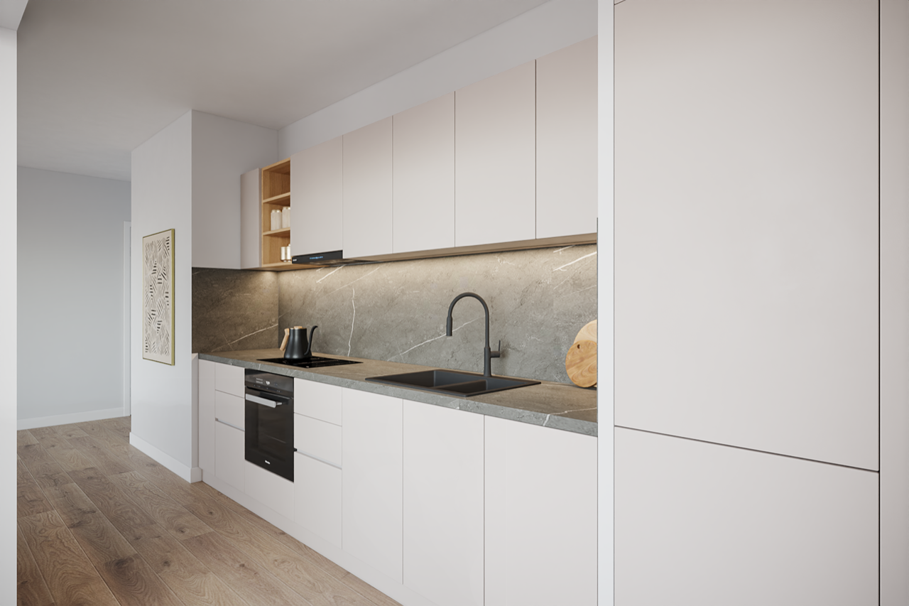 Die stilvolle Ausstattung der Wohnungen – von Ein-Zimmer-Apartments bis hin zu großzügigen Drei- und Vier-Zimmer-Familienwohnungen – lässt keine Wünsche offen. Hochwertige Bodenbeläge, eine angenehme Fußbodenheizung und moderne Einbauküchen mit Markengeräten schaffen ein Wohnumfeld, das nicht nur praktisch, sondern auch wohnlich ist. Die großzügige Deckenhöhe von ca. 2,71 m unterstreicht das offene Raumgefühl und sorgt gemeinsam mit großen Fensterflächen für ein helles, freundliches Ambiente.